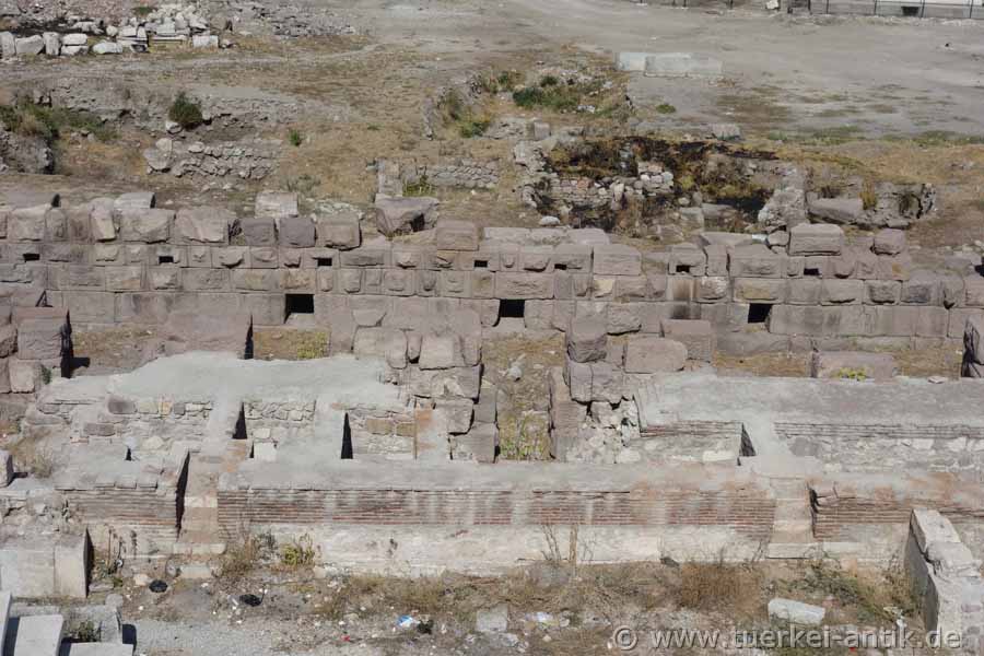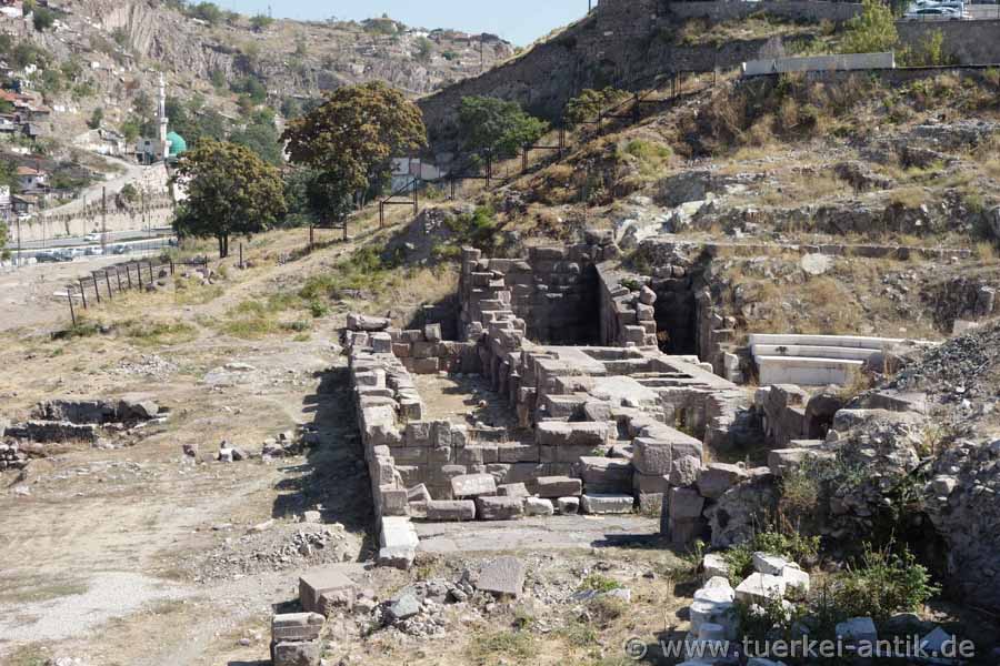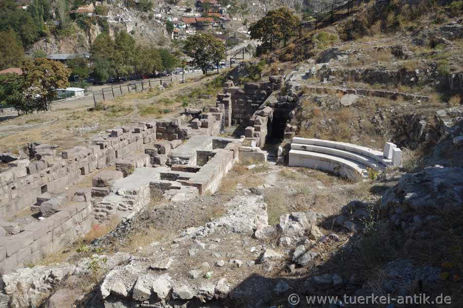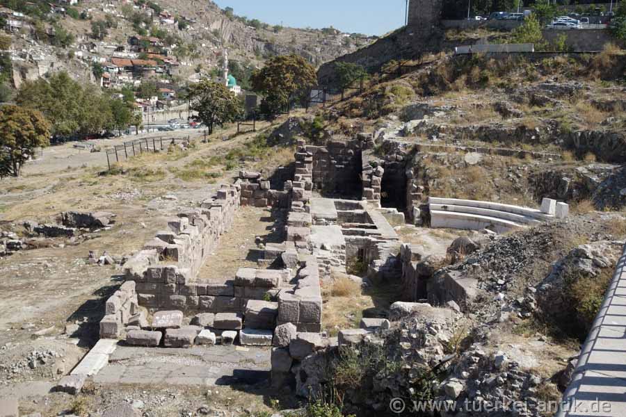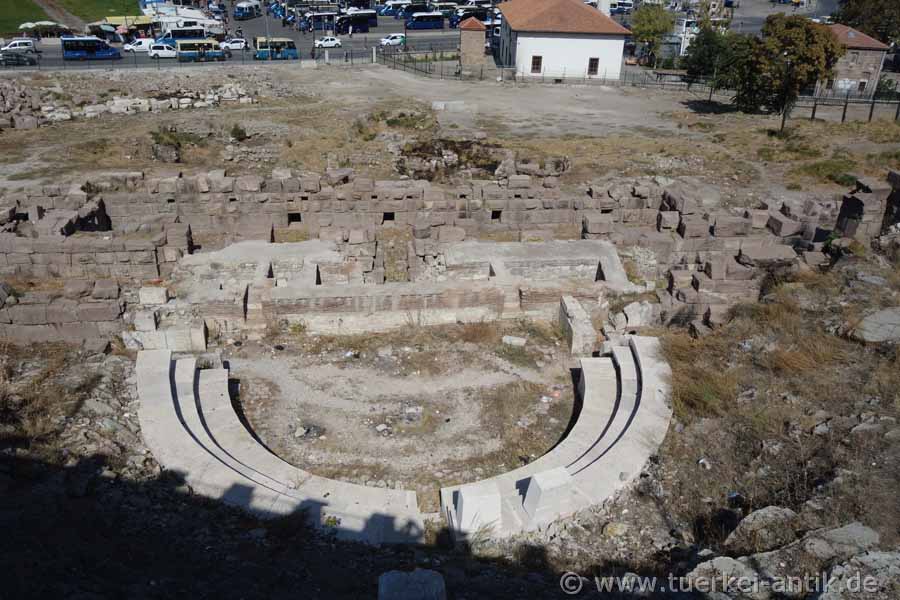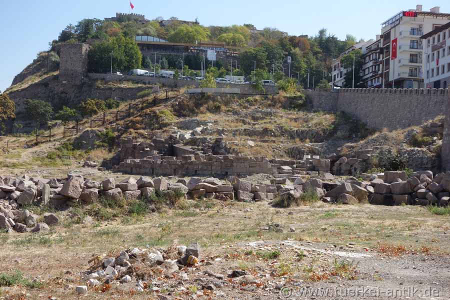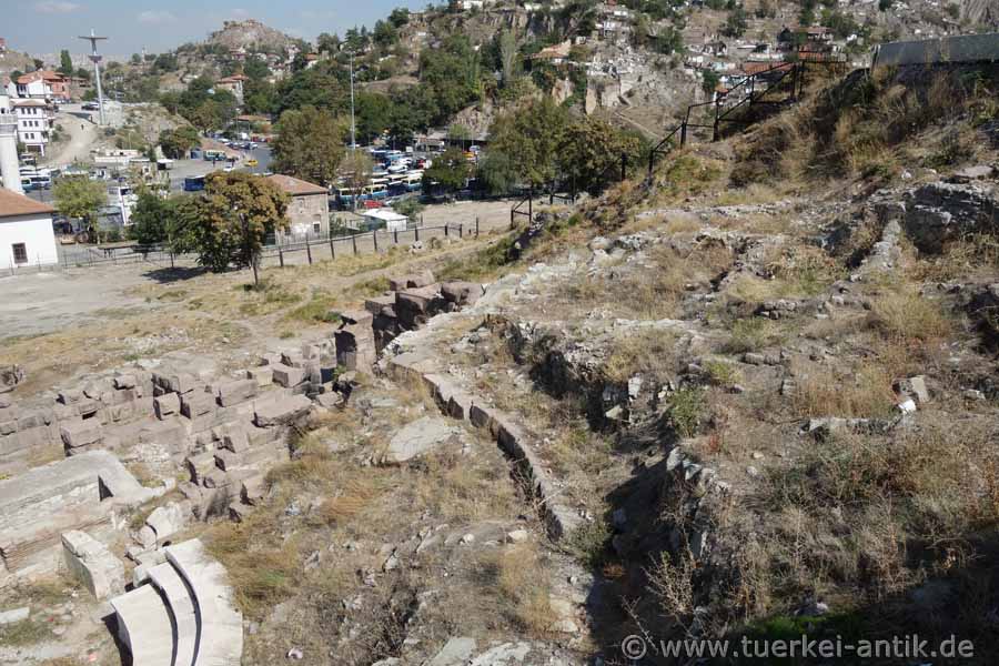 The Roman theatre of Ankara (Ancyra) is located in the centre of the historical quarter below the fortress, directly on the Hisar Parkı Cad. Until late summer 2018, the remains of the theatre were hardly noticed. After three rows of seats had been reconstructed at the beginning of the new century for unknown reasons, only young people and Yunkees were interested in the old walls. |