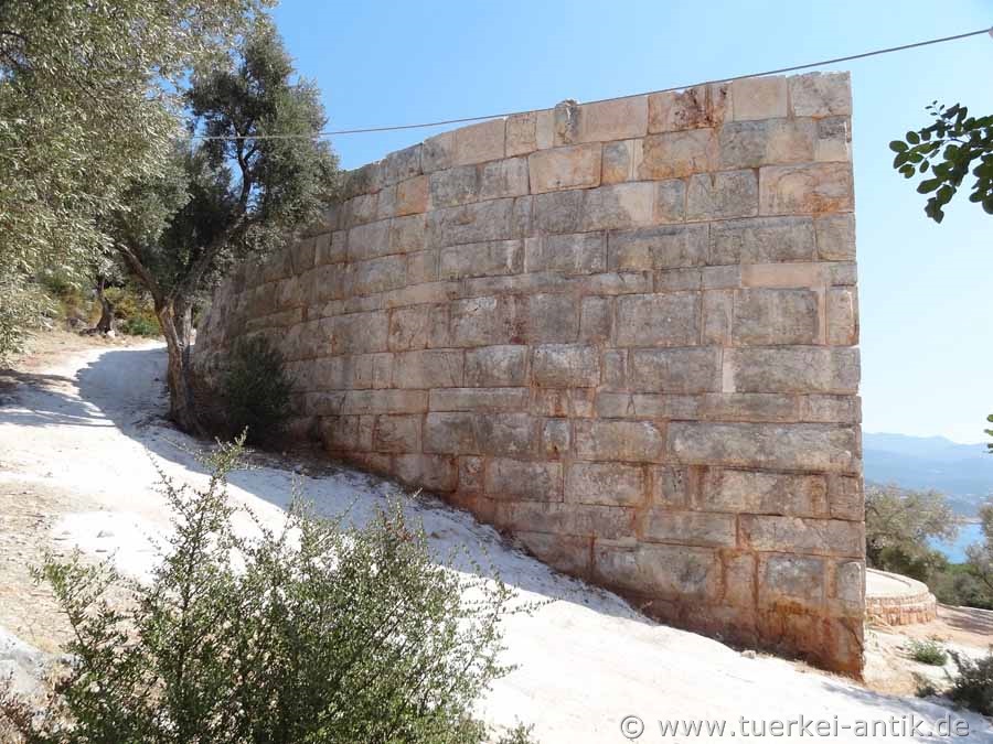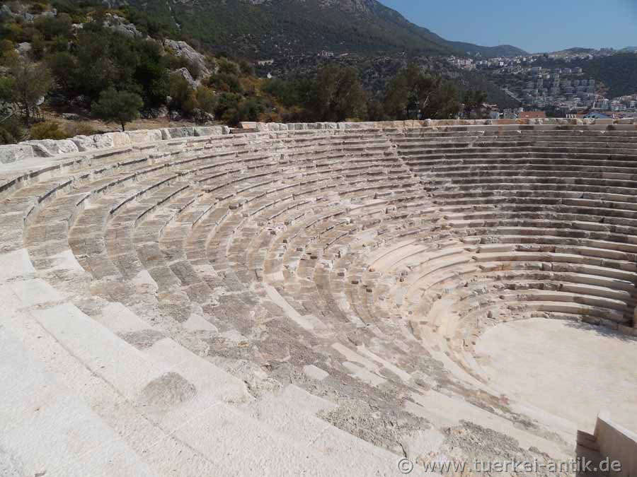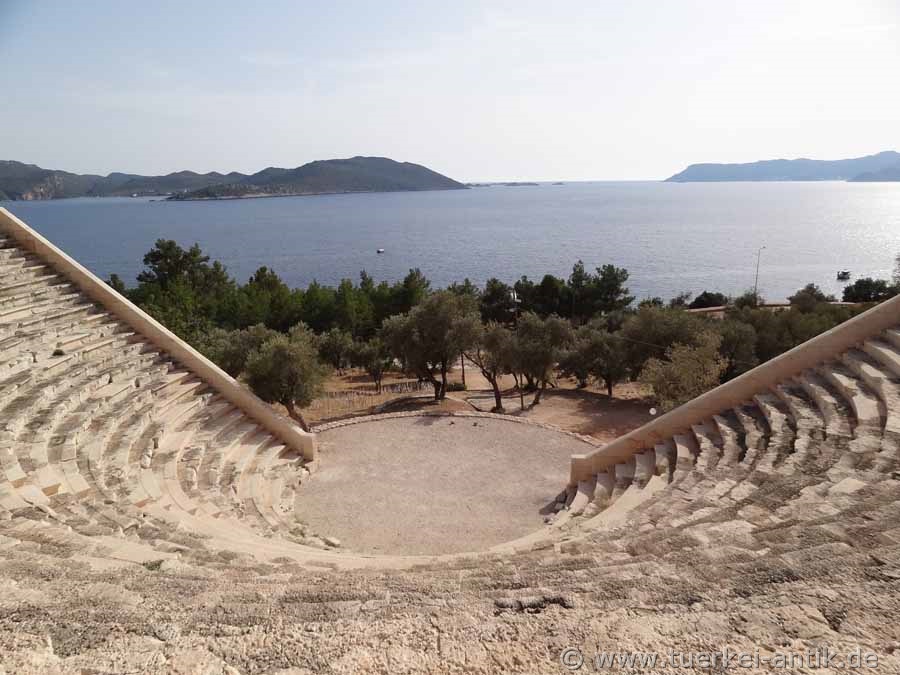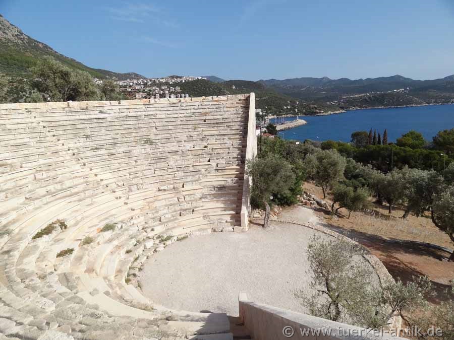 Founded by the Lycians, Antiphellos was the port city of the mountain town of Phellos, 17 km away. The original name of the town was Habesos or Habesa. The first written mention under the name Antiphellos is a bilingual tomb inscription from the 4th century BC. Only a few testimonies of the city's turbulent past are preserved. To the west of the present port there are remains of the former sea wall, to the north of which the remains of a Hellenistic temple have been preserved. It was already built in Lycian times and was restored and rebuilt several times in the following centuries. It is believed to have been dedicated to Poseidon, the protector of seafarers. If one circles the Acropolis Hill in a westerly direction, one comes across a Doric tomb completely carved out of a rock. (photo) Except for small damages in the upper area, the tomb is completely preserved. A few meters below this tomb there is a Lycian rock tomb with an inscription in Lycian script above the door opening. Antiphellos was incorporated into the Lycian League in the 6th century BC and minted its first coins in the 3rd century BC. From this time some artefacts survived the times. The city, occupied by pirates in the 1st century BC, developed into modest prosperity after its expulsion by the Romans as part of the Roman province of Lykia at Pamphilia. Remains from Roman times, however, are not preserved. |