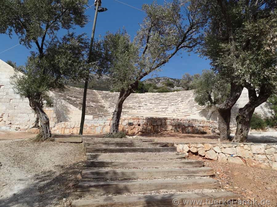 The Hellenistic theatre from the early 1st century BC was built on a slope by the sea. The once surely wooden stage house has not been preserved. The cavea, open to the sea, holds 26 rows of seats. |