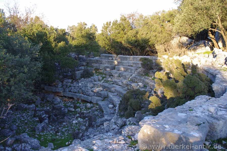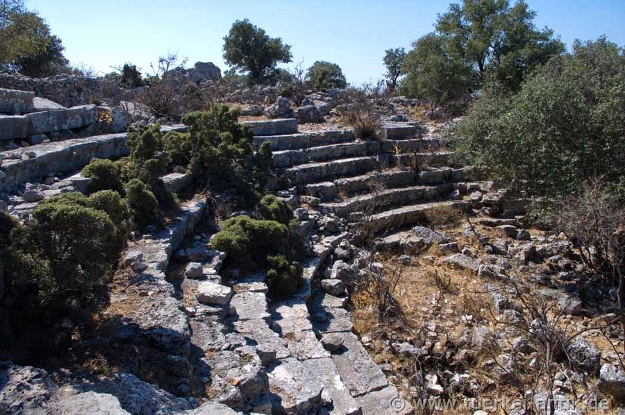The originally Lycian city of Apollonia (the Lycian name was lost) was connected from time immemorial with the nearby port city of Aperlai, but had to subordinate itself to it in Hellenistic times and surrender parts of its territory. It only seems to have regained its importance in the Roman Empire. This is also supported by the fact that during this time Apollonia was the site of large imperial buildings such as the theatre, the three-room spa and a monumental heroon. Nevertheless, from the 3rd century B.C., Aperlai, in the Lycian League, took the lead in the newly founded Sympolitie, a union of the cities of Apollonia, Simena, Isinda and Aperlai, a union of two or more originally separate places into a common polis. On the hilltop of the settlement hill a castle was already built at the time of the first settlement, where even in Byzantine times extensions and improvements were made. |