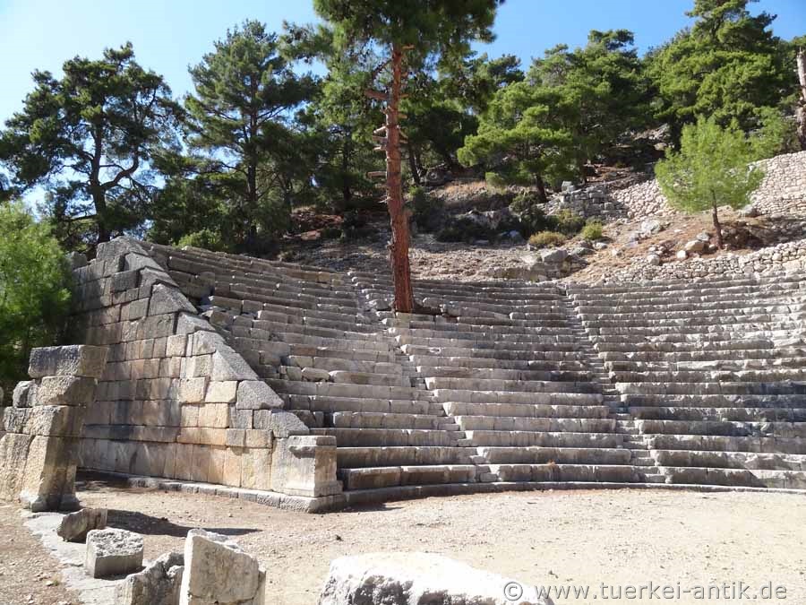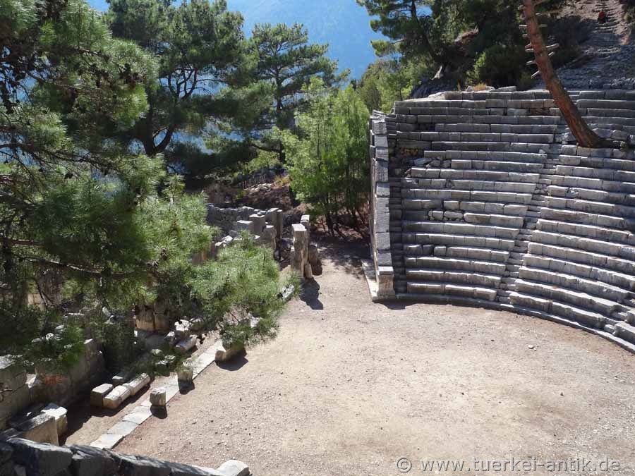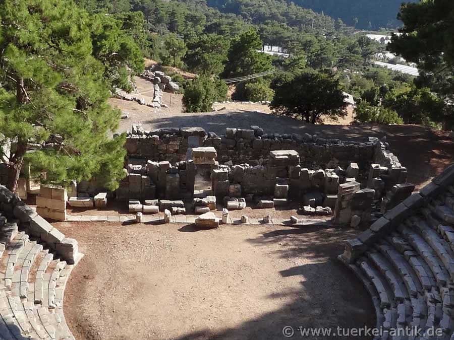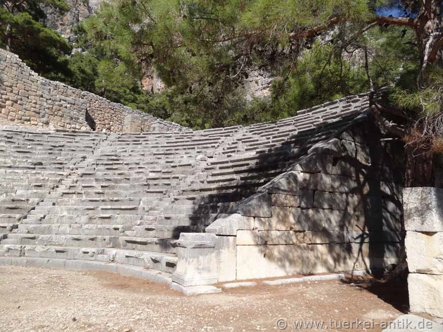 The (Greek) theatre of Arykanda dates back to the 2nd century B.C. The cavea was beaten directly into the mountain below the stadium. It has 20 rows of seats, which are completely preserved. The stage house is 26 m wide. |