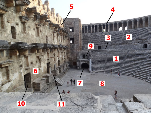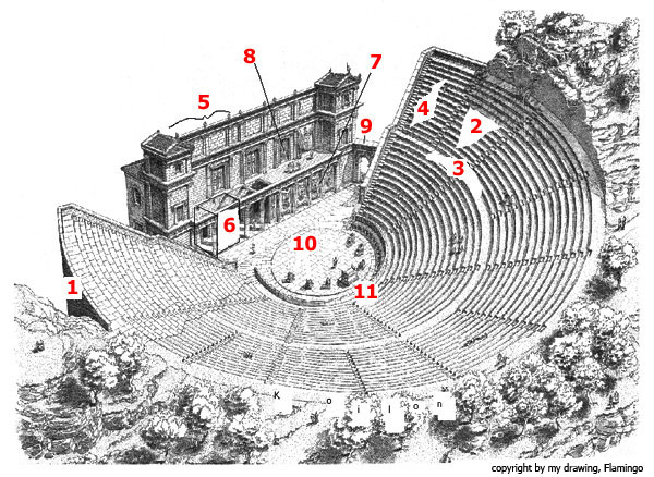 A significant improvement in acoustics was achieved by vaulting over the lateral entrances to the auditorium (7 = parodoi), so that a completely enclosed space was created. |
