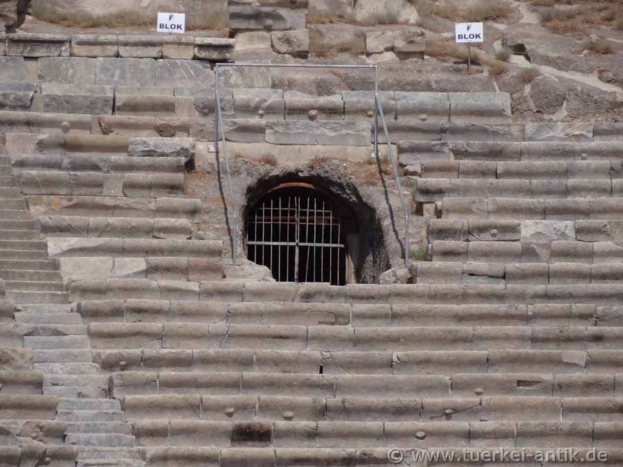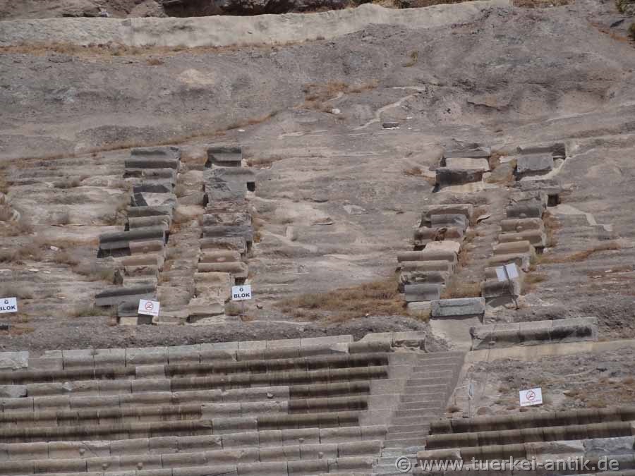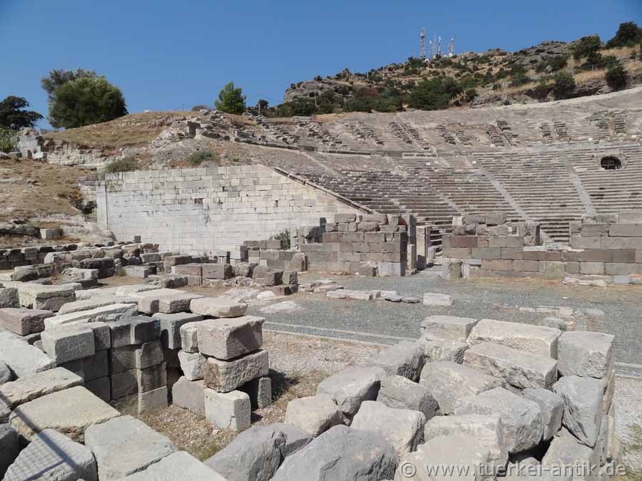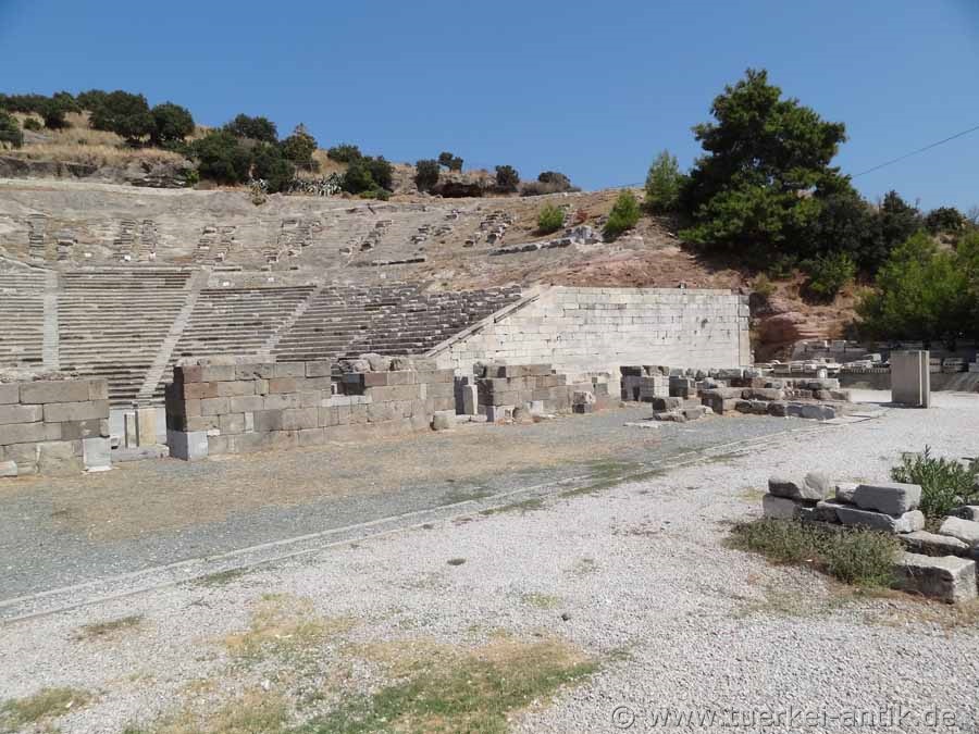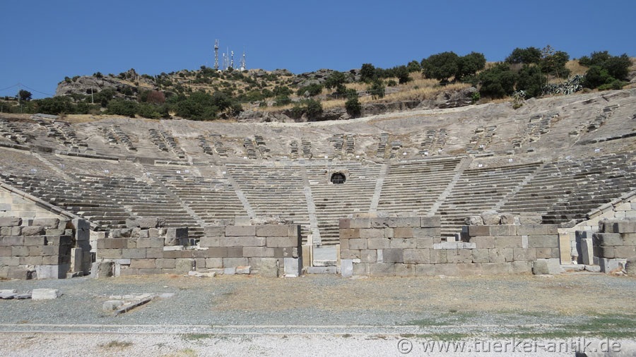 Archaeologists disagree that the Hellenistic theatre was built either in the 1st half of the 3rd century BC or in the late 2nd century BC. The lower part of the cavea was completely cut out of the rock. The stage building was rebuilt during the Roman Empire. Apparently, however, the theatre was not converted into a closed Roman theatre typical of this period. The original stage house is said to have already had a 2-storey scene (stage facade) when it was built, but at the latest in the 2nd century BC. Restoration works in the years 1976 and 1985 were stopped due to lack of financial equipment already after short time again. Only in 2000, under the direction of the Bodrum Museum of Underwater Archaeology and with the help of sponsorship from the telecommunications companies Turkcell and Ericsson, the theatre began to be renovated. At the end of June 2003 the work was completed and the theatre opened to the public. |
