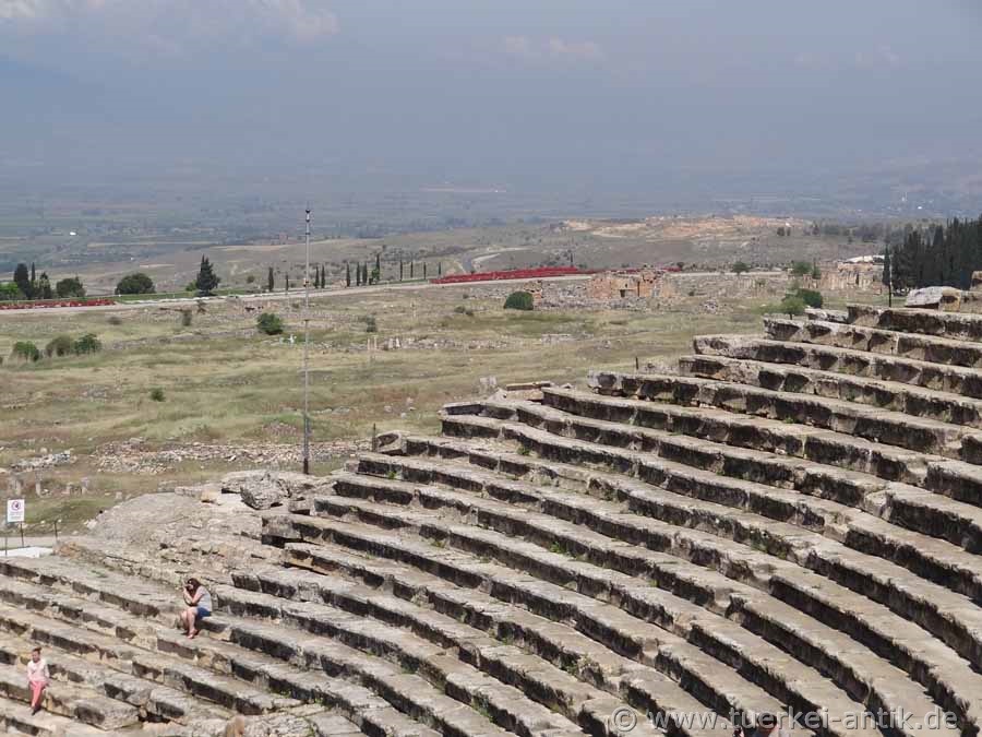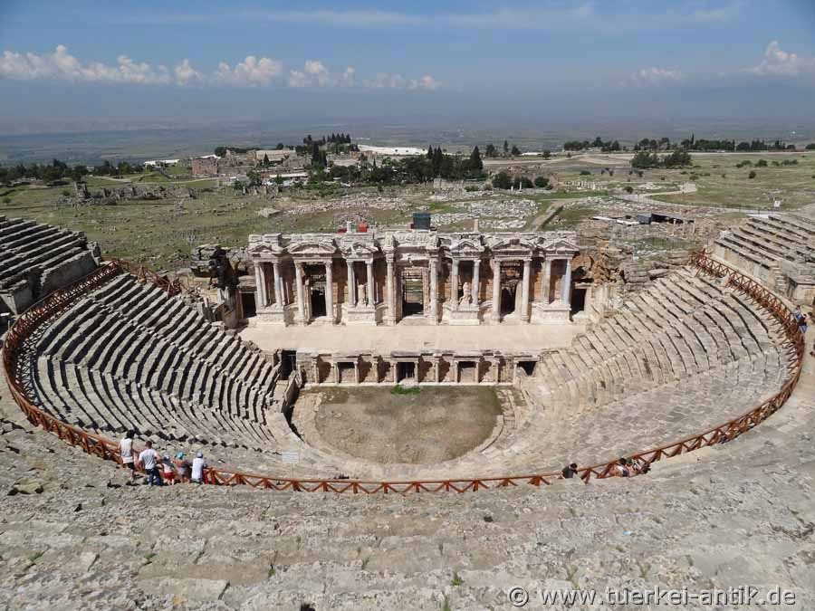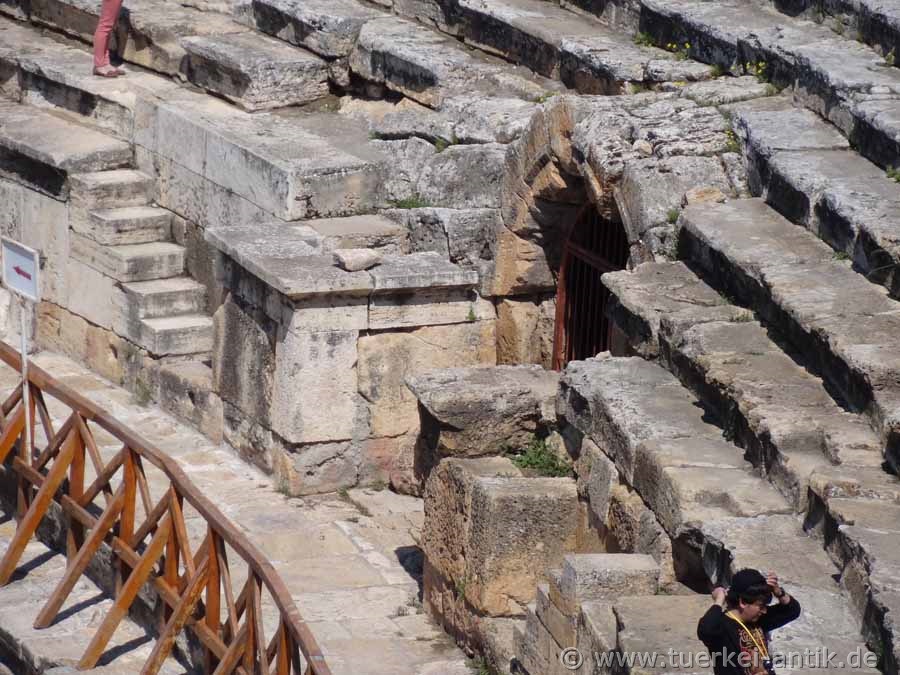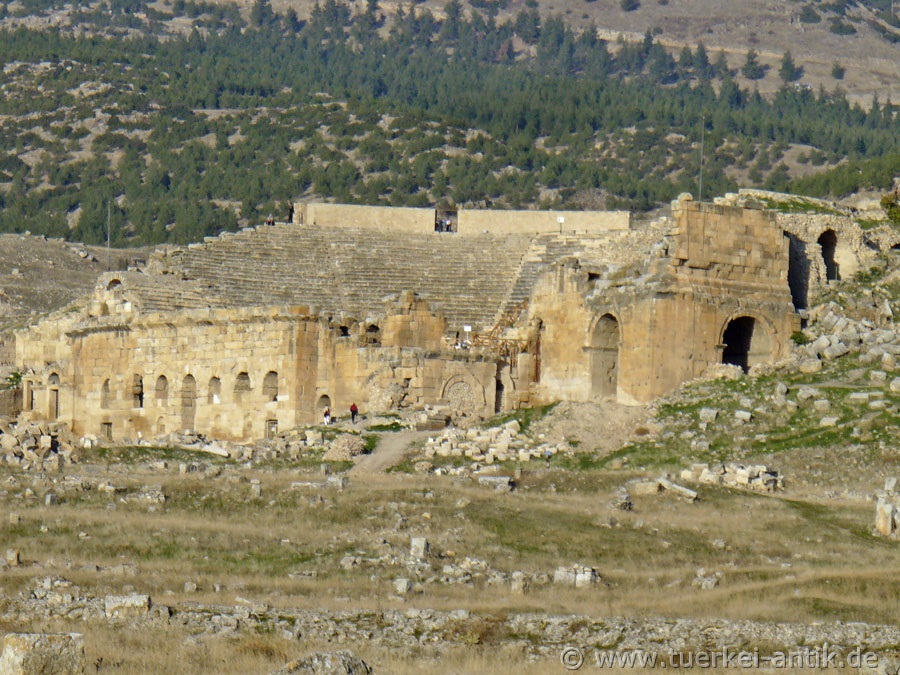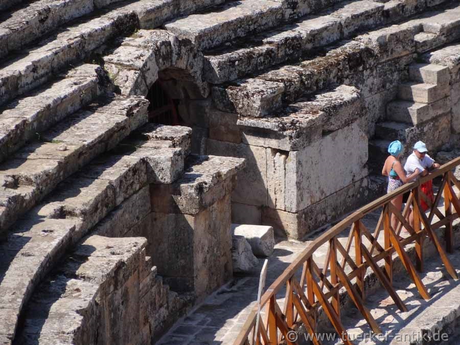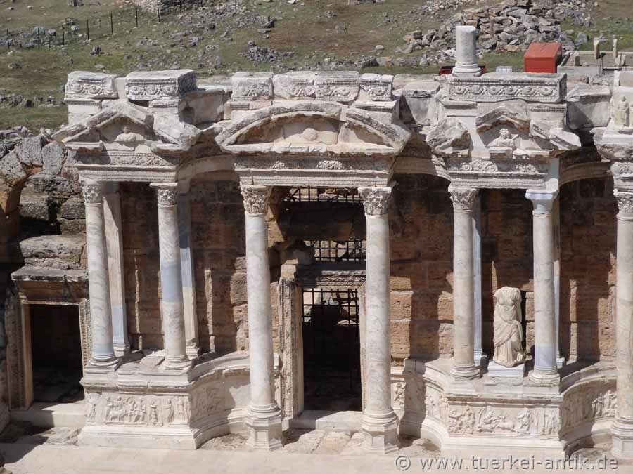 The Roman theatre of Hierapolis, built after a devastating earthquake in 60 AD, replaced the much older Hellenistic theatre from the 2nd century BC, which was almost completely demolished for the construction of the new theatre. In the course of time, the theatre underwent several restorations and minor extensions. On the occasion of Emperor Hadrian's visit to Hierapolis in 129 AD, the stage house underwent extensive extensions. In the 4th century AD, under the Eastern Roman Emperor Constantius II († 3 November 361), the orchestra was rebuilt for animal fights and water games. The lowest (first) tier consists of 20 rows of seats. Above the gallery there are 25 rows of seats in the 2nd tier. On the central axis of the first tier there is a prominent box reserved for the emperor and his closest followers. |