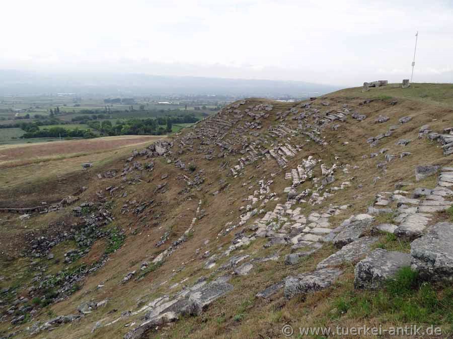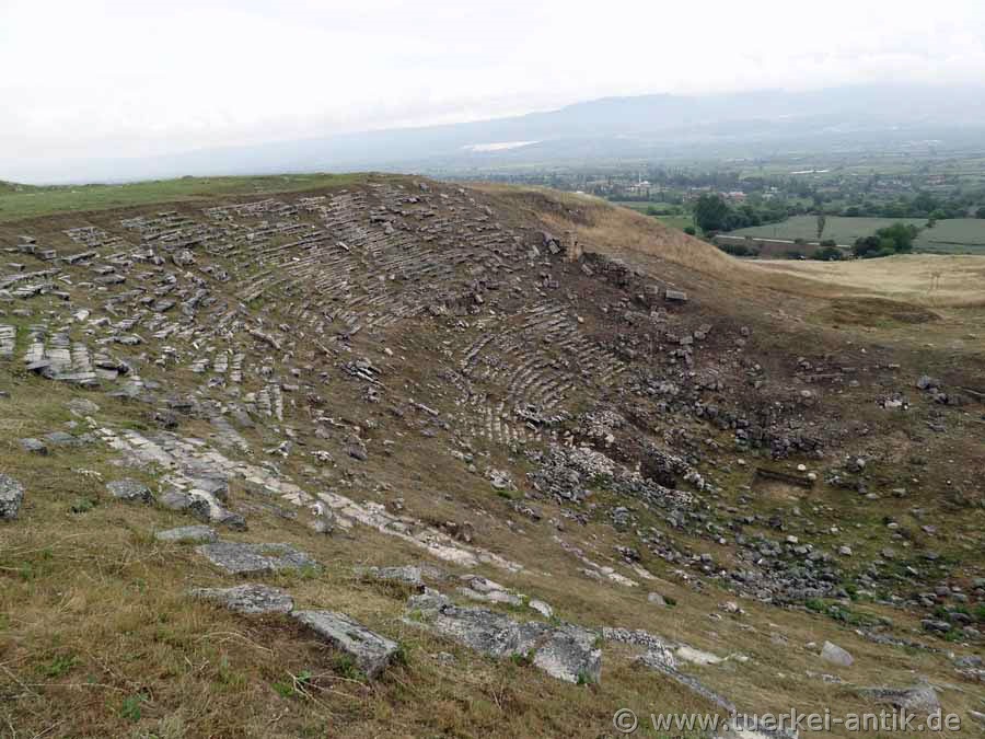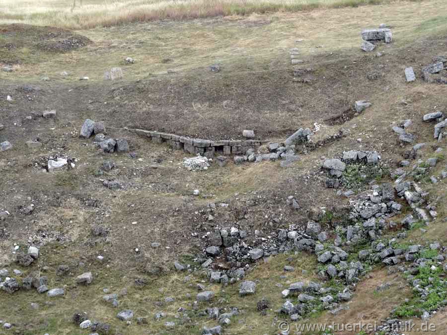 The North Theatre was built in the 2nd century AD. The theatre is completely built into the slope with a view to the northeast on the Lykos plain. Although many rows of seats have slipped from their original positions and some have been removed for limestone extraction, 19 rows of seats can be found in the lower tier (ima cavea) and 27 rows of seats in the upper tier (summa cavea). |
