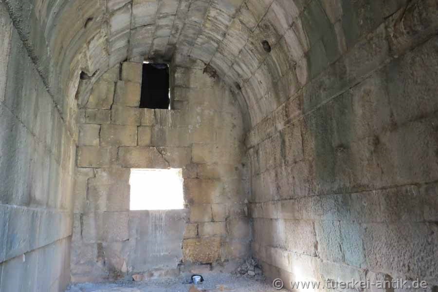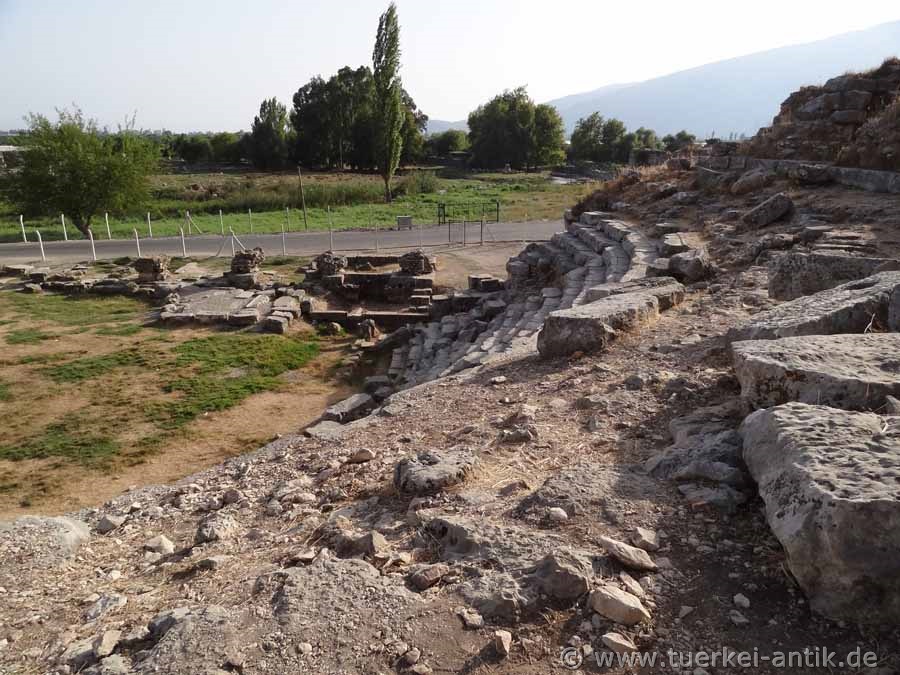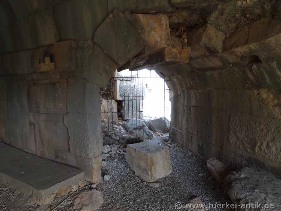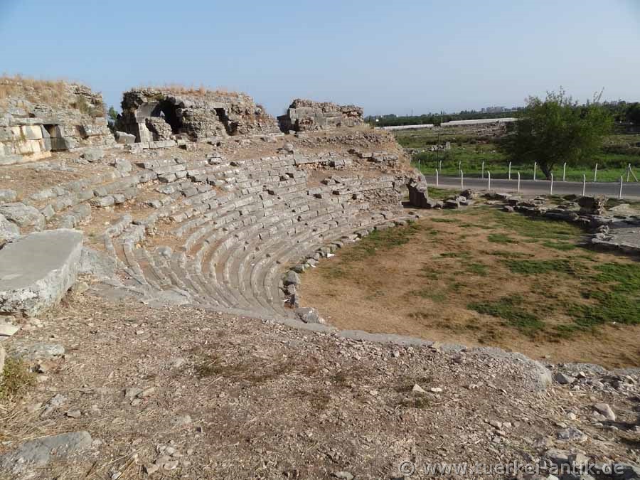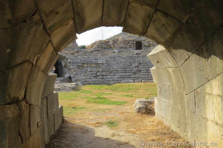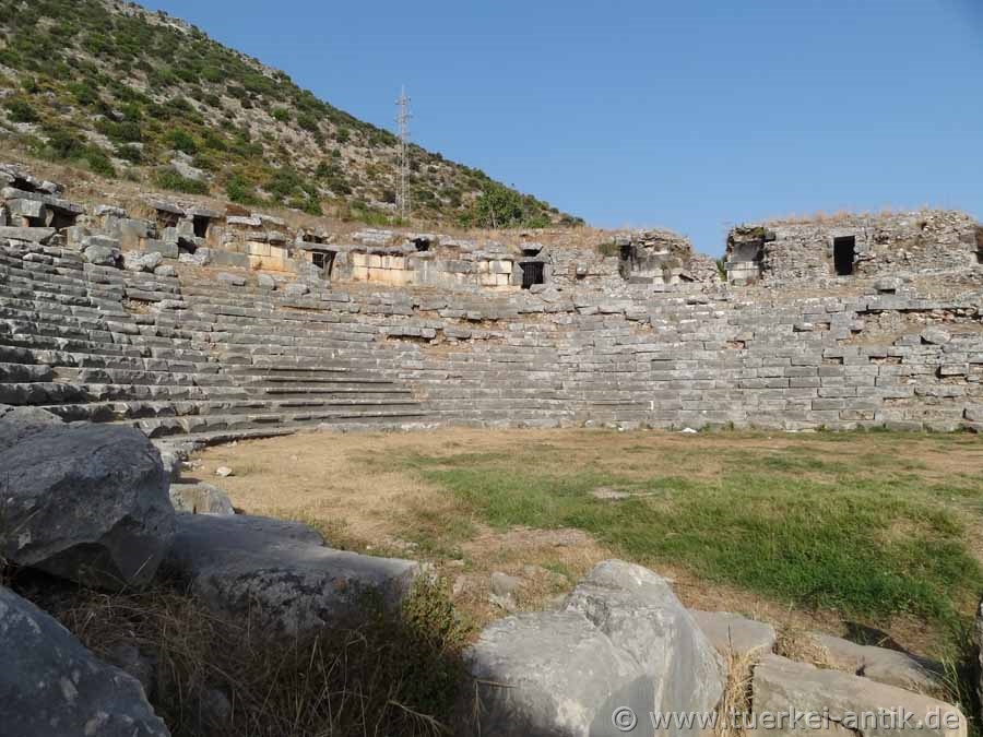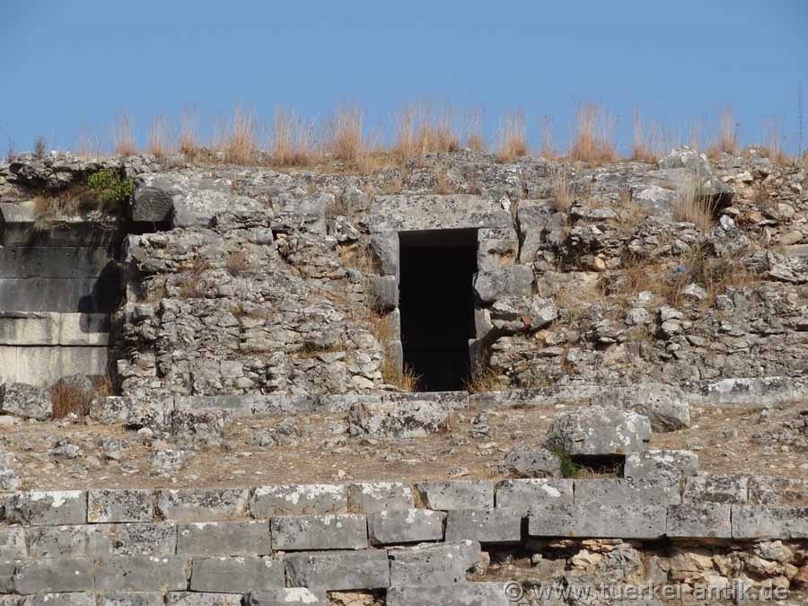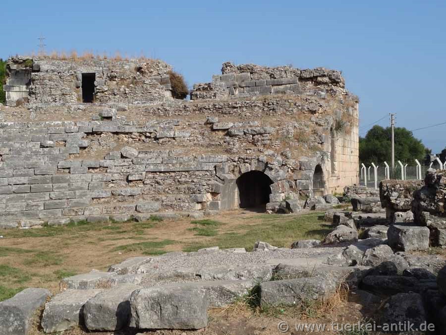 The Hellenistic theatre of Limyra became the end of the second, beginning of the first. It was built in the tradition of Greek theatres. Contrary to the usual procedure of leaning the cavea against a ground elevation, this theatre was completely free. Today's impression is deceptive, as the earth that slipped down from the hill over time buried the outer entrances to the rows of seats. The visible state of the building today shows the status of the restoration work in the 2nd half of the 2nd century AD. After this construction measure, the building had a capacity of approx. 15,000 spectators. The theatre, like the entire city and several other cities of the Lycian League, was destroyed after a devastating earthquake in 141 AD. The stage house was rebuilt with the help of donations from the Rhodiapolis-based Euerget Opramoas. Today, not much more exists of the stage house than the foundations. |