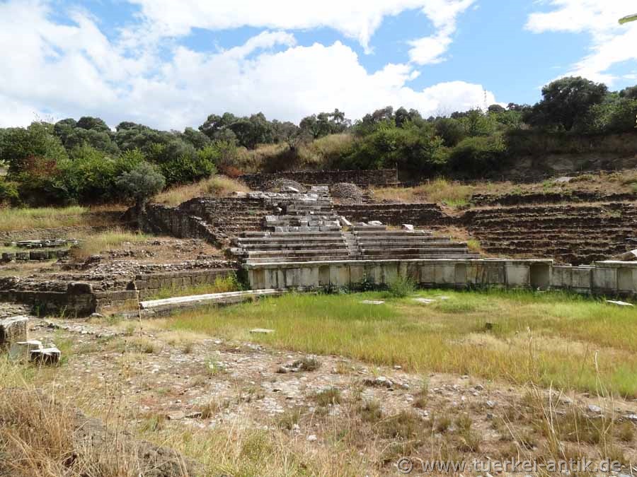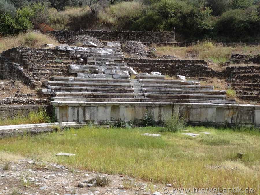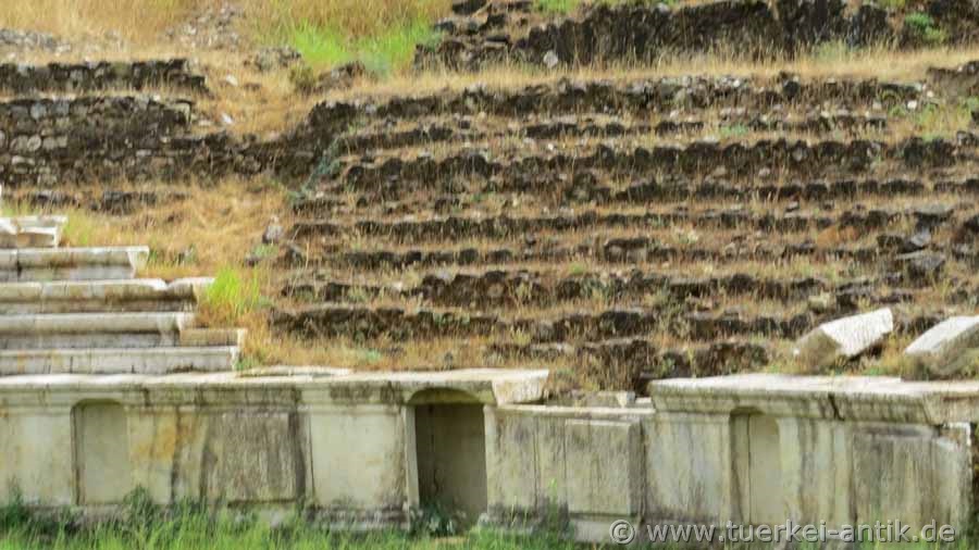 prohedrie (special seating blocks) at the front of the podium shows that the building has a special plan compared to ordinary theatres. It is therefore referred to as the "theatron" (seat tribune) because the exact function is unknown. |