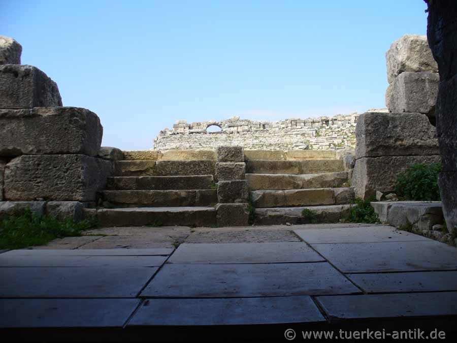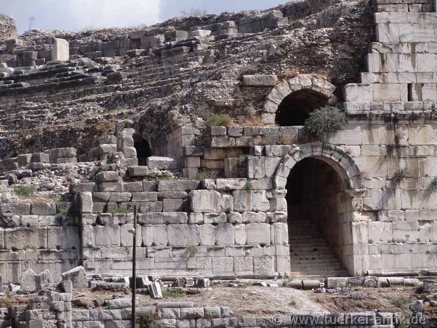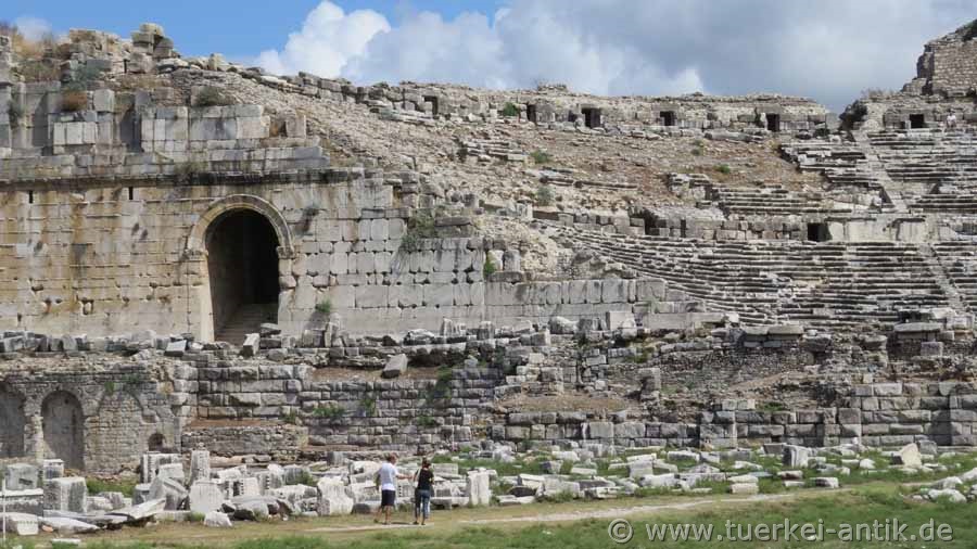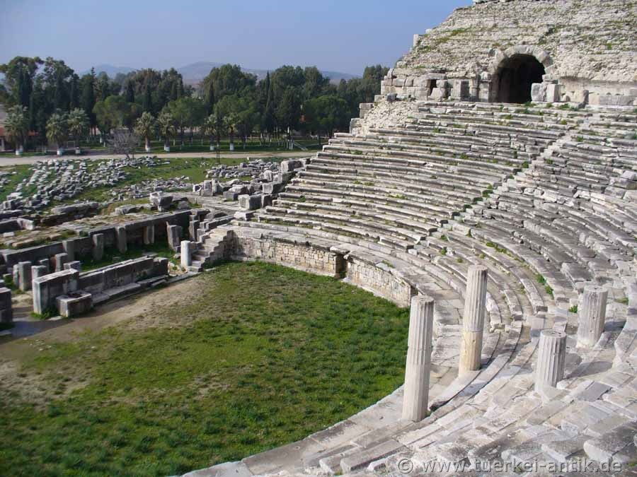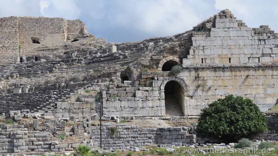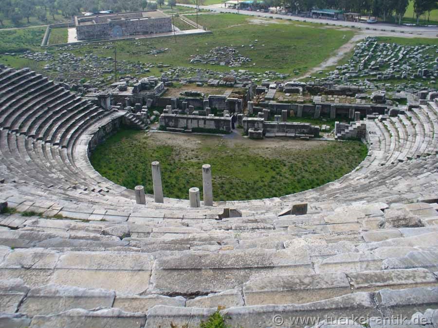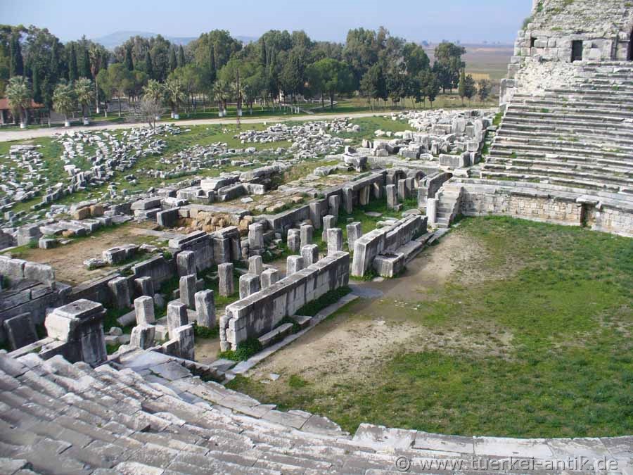 The city of Miletus shared the same fate as the cities of Herakleia on Latmos, Magnesia ad Maeandrum and Priene, they were founded in the wrong place. What nobody could know was that the river Mäander (Turkish: Büyük Menderes), due to the large quantities of sediments that it had always carried with it, slandered the entire Gulf, so that Herakleia became a place on an inland lake and Priene now lies far inland. Miletus itself lay on a promontory that protruded into the then existing Gulf. Milet gained its economic importance through its four ports, which were located in the usable bays around the headland. According to tradition, Miletus was re-founded in 1053 BC by Ionic colonists. From the 8th century BC onwards, Miletus developed into an important transhipment point for trade with the Orient through the four ports. Purple fabrics from Miletus as well as other textiles, but also wool and olive oil were coveted trade goods. Miletus became one of the most important Greek cities and at times ruled the Aegean Sea. Miletus founded over 80 colonies. Miletus was called the Head of Ionia because of its extensive trade activities and the number of its colonies. In the 7th century BC, the Greek cities on the west coast of Asia Minor came into conflict with the neighbouring empires of the Lydians and later the Persians. In the 6th century BC the city was first subdued by the Lydian king Kroisos, then by the Persians under Cyrus II. An uprising of the Ionian Greeks against the Persian Empire (Ionian uprising), starting from Miletus, failed. Miletus was conquered and destroyed by the Persians in 494 BC. The reconstruction of Miletus was carried out according to the ideas of Hippodamos of Miletus. Until the Alexander campaign the city was under Persian supremacy in the 4th century BC. In Hellenistic times different powers ruled in Asia Minor, thus also over Miletus. 133 B.C. Miletus was bequeathed to Rome together with the kingdom Pergamon and became part of the Roman province Asia. Miletus remained of secondary importance in the following period, as the Romans chose Ephesus as the capital of their province Asia. Nevertheless, numerous representative buildings were erected in Miletus during the imperial period. Like Ephesus, there was an early Christian community in Miletus. The New Testament reports in Acts that the Apostle Paul, on his last missionary journey before returning to Jerusalem, said goodbye to the leaders of the church in Ephesus. In late antiquity, i.e. between 280 and 560 AD, there was a sharp decline in population. To protect it from enemy raids, the great theatre was fortified and provided with a fort at the highest place to protect it. Houses were built in the auditorium. During this time Miletus was of particular importance as a bishop's seat. In Ottoman times, the princes of Menetsche temporarily chose their seat in Miletus and left numerous representative buildings. An example of this is the excellently preserved Ilyas Bey Mosque near the Faustina Baths. In the following years it became quiet around Miletus. Until a severe earthquake in 1955 there was a village called Balat on the ruins. After the earthquake, the settlement was moved to the south, outside the city area. |