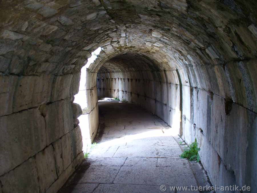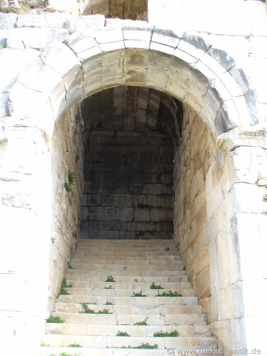 The Roman theatre of Miletus was built under the Roman emperor Trajan (98 -117 AD) over a much older Hellenistic theatre. While the overbuilt theatre had 5,300 seats, the Roman building was designed for around 15,000 spectators. From the very beginning, the orchestra was also designed for gladiatorial and animal fights. The location of the theatre, which was unfavourable in many respects, was chosen for practical reasons in an existing hollow of the natural ground elevation. Only the third, upper tier was given a vaulted construction as a substructure. The axis of the theatre is thus diagonal to the axes of the Hippodamian city map, according to which most of the public buildings were oriented. |