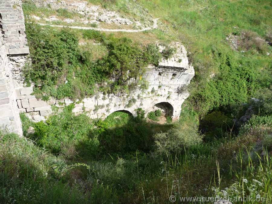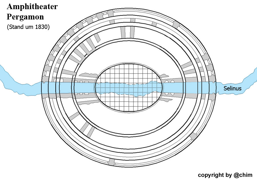 The Roman amphitheatre is situated in a side valley of the Selinus and is within sight of the Greek theatre built on the western slope of the Acropolis Mountain. The Selinus, which flows through the lower town of Pergamon and is overbuilt under the "Red Hall" on a length of almost 200 m and thus as the "Bridge of Pergamon" was by far the longest river overbuilding of antiquity, flows through the longitudinal axis of the amphitheatre. Here, too, the course of the river was vaulted. This difficult location had its advantages. On the one hand, the water needed in the arena was immediately available, on the other hand, the location had the advantage that the natural slopes of the river course could serve as a substructure for the lower rows of seats. |
