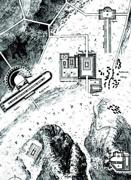 The drawing shows the hypothetical reconstruction of the city of Pessinus by Charles Texier. Several assumptions turned out to be wrong, such as the existence of a coherent complex consisting of a large theatre and a stadium adjacent to it. The investigations of the University of Ghent clearly prove this. |