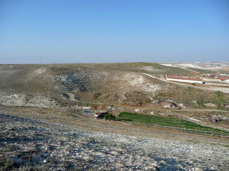 It is not known exactly when the great theatre was built. It is still unearthed. Today only the hollow of the cavea can be seen (see photo). It is said that the theatre was last extensively restored under Hadrian (117-138 A.D.). It is located on the northern slope east of the village Ballıhisar. The seat stones were completely removed by the local farmers in the last two centuries. |