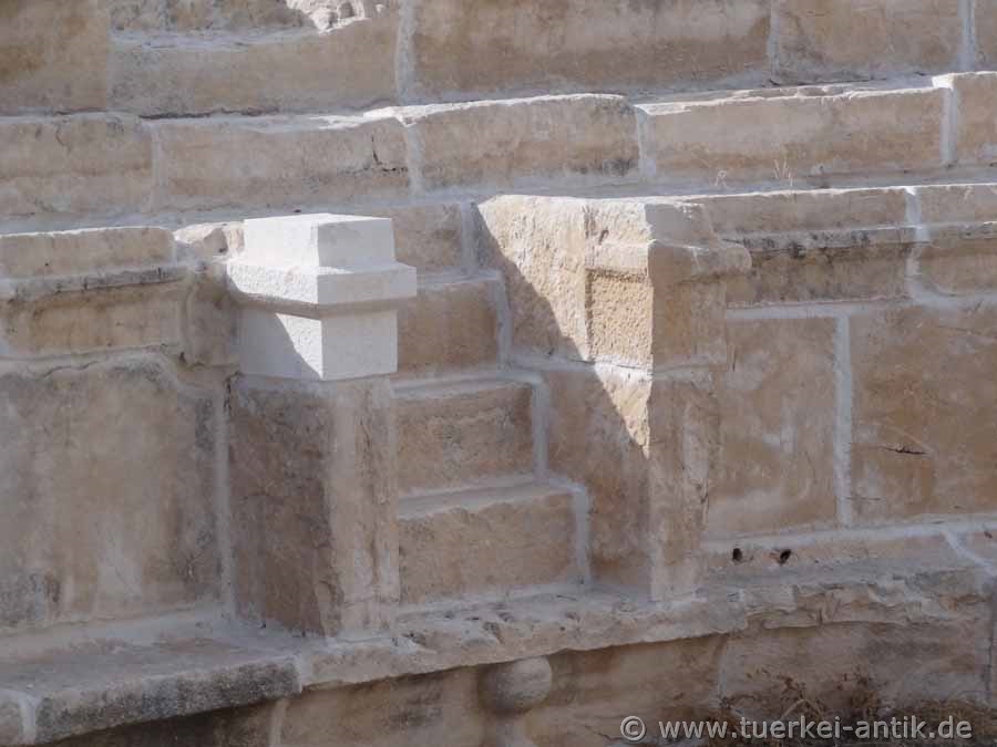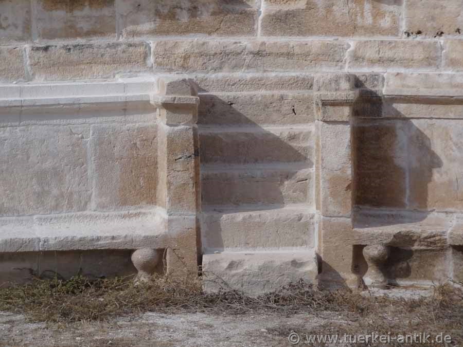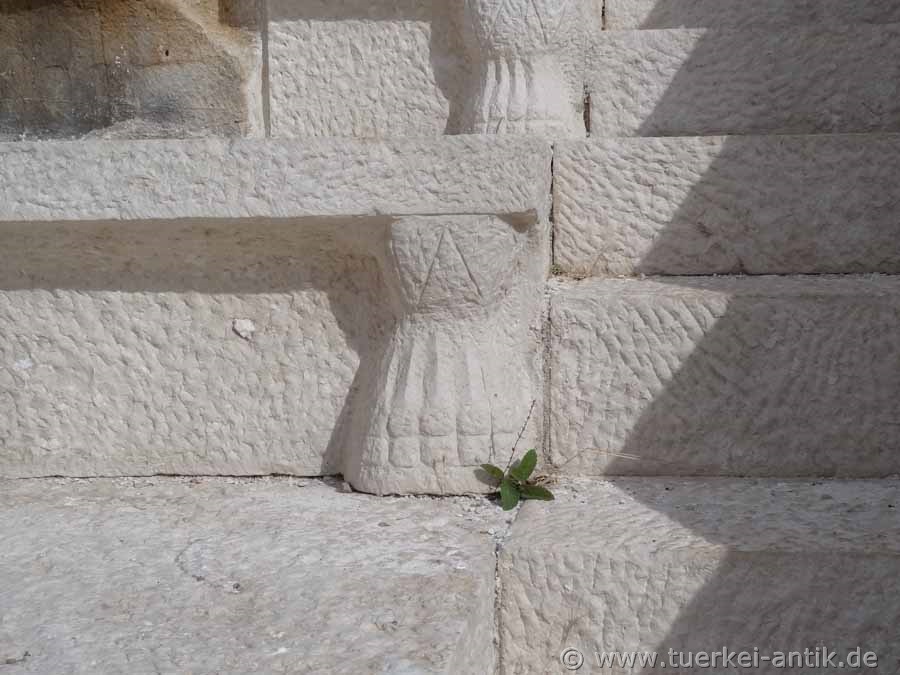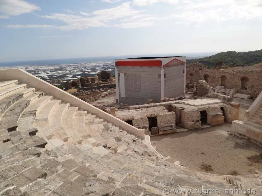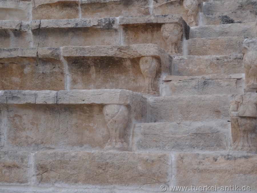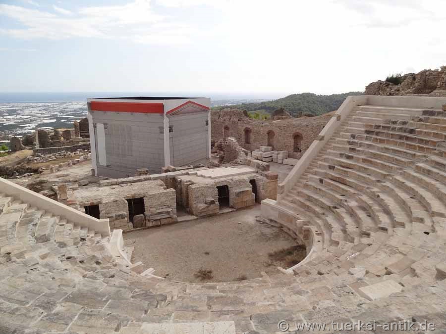 The (Greek) theatre of Rhodiapolis was probably built at the end of the 1st century BC and expanded in Roman times. The stage house was undoubtedly built during the Roman Empire. The devastating earthquake of 141 AD also affected Rhodiapolis and the theatre. The Euerget Opramoas of Rhodiapolis, one of the richest men in the ancient world, had - according to the inscriptions immortalised on his mausoleum - donated considerable sums of money for the reconstruction of the destroyed Lycian cities. This was also the case for the restoration of the theatre in his hometown. On the square in front of the theatre, a mausoleum was erected for him, with inscriptions on its outer wall testifying to his generosity and thus remaining in the memory of posterity. |