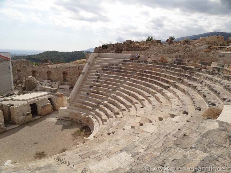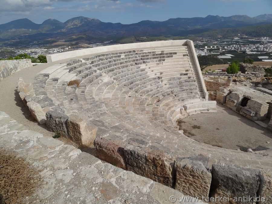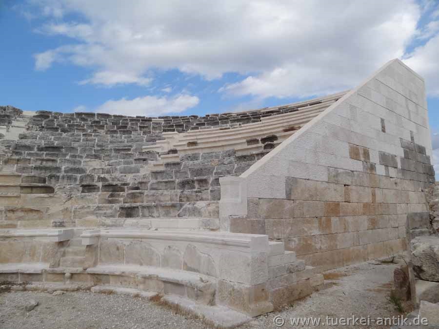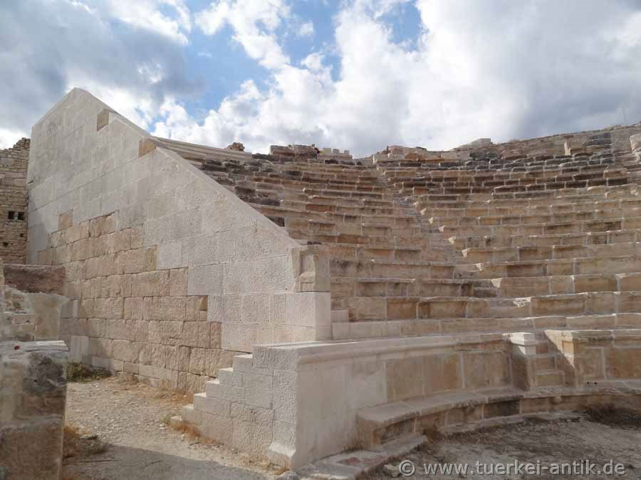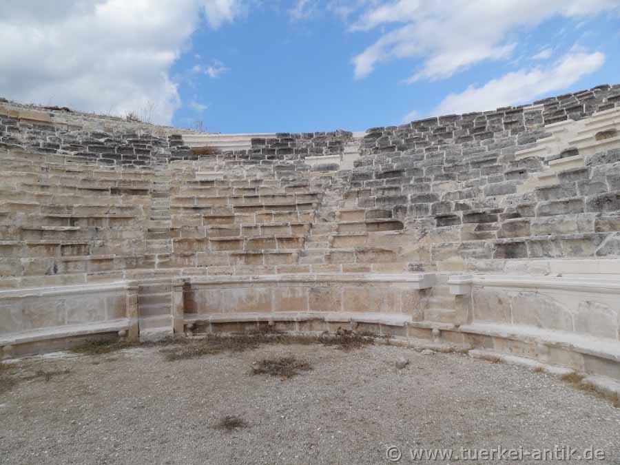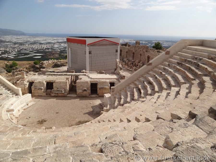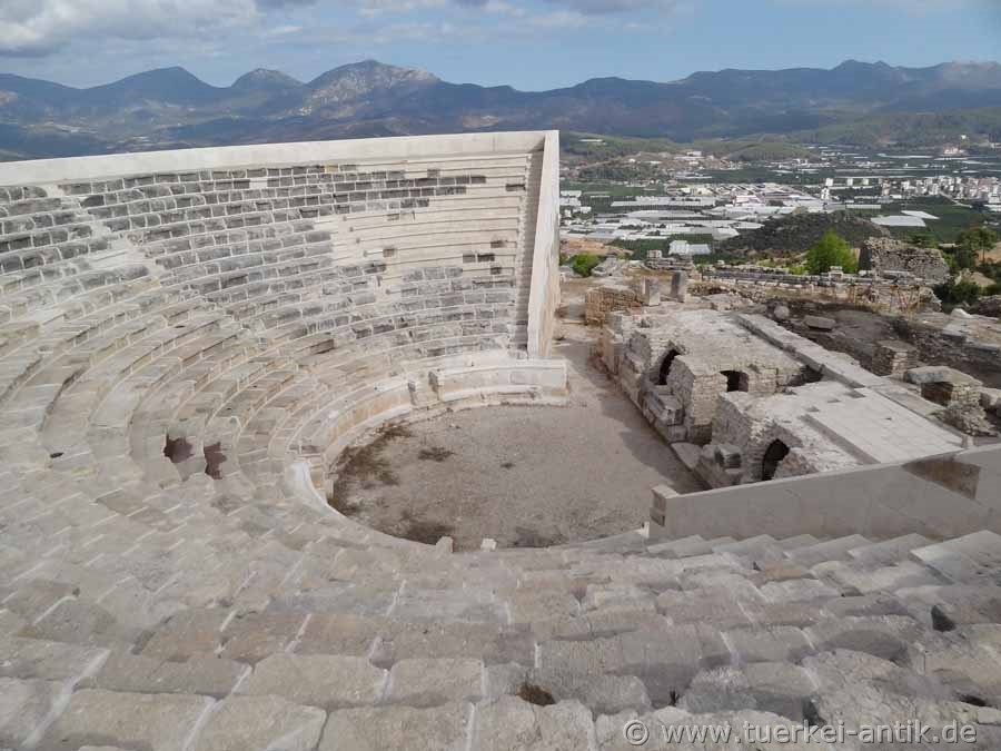 The (Greek) theatre of Rhodiapolis was probably built at the end of the 1st century BC and expanded in Roman times. The stage house was undoubtedly built during the Roman Empire. The devastating earthquake of 141 AD also affected Rhodiapolis and the theatre. The Euerget Opramoas of Rhodiapolis, one of the richest men in the ancient world, had - according to the inscriptions immortalised on his mausoleum - donated considerable sums of money for the reconstruction of the destroyed Lycian cities. This was also the case for the restoration of the theatre in his hometown. On the square in front of the theatre, a mausoleum was erected for him, with inscriptions on its outer wall testifying to his generosity and thus remaining in the memory of posterity. |