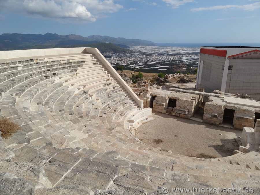 Little is known about the ancient city of Rhodiapolis. The time of the first settlement still lies in the darkness of the past. One suspects however already lykische origins. It seems that at least the name of the city can be traced back to settlers from Rhodes, who named the newly founded city after their homeland. Rhodiapolis = city of the Rhodians. (Polis => town, Acropolis => upper town) The remains of an excavation tower prove the Hellenistic foundation beside the name of the town. However, the city experienced its heyday during the Roman Empire. The majority of the buildings visible today date from this period. One of the richest men in the ancient world lived in Rhodiapolis during this period: Opramoas. Opramoas is considered the donor of many architectural monuments in this region. For example, an inscription on the theatre of Myra says that it was rebuilt after the earthquake of 141 A.D. with funds from the Euerget Opramaos of Rhodiapolis, a prime example of Euergetism, especially in Hellenism and during the Roman Empire, Euergetism was particularly important in the cities of the eastern Mediterranean. Powerful and wealthy members of the municipal councils underlined their claim to leadership in their respective cities with foundations, games or grain donations and non-profit buildings such as baths, theatres and aqueducts. In his honour, a mausoleum was erected in front of the theatre, which was reconstructed and rebuilt in the autumn of 2015 using the preserved components. After the first excavations by Austrian archaeologists about 100 years ago, Rhodiapolis had fallen into oblivion again. Only a forest fire in the 90s of the last century brought the meanwhile completely overgrown ruins back to daylight and thus into the consciousness of the public. |