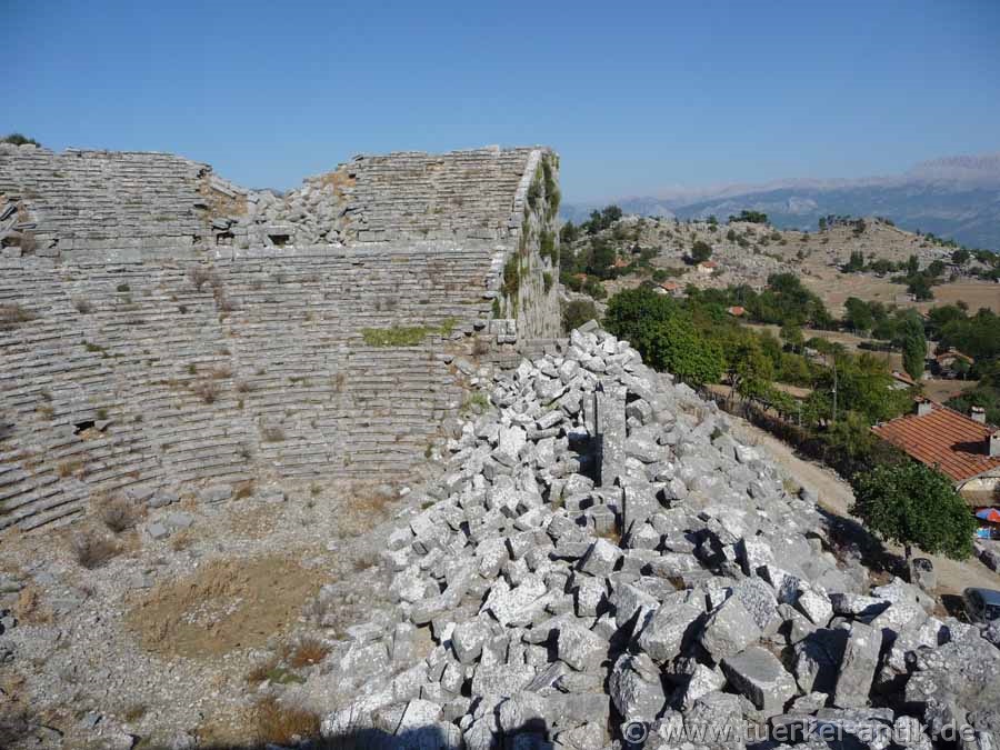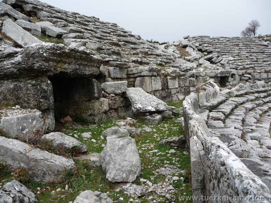 The (Roman) theatre from the 2nd century A.D. was built with its cavea in the Greek-Roman style in a natural hollow of a mountain slope. The lateral wings were built with masonry. It is divided into 2 tiers by a gallery. The first, lower tier has 30 rows of seats, while 15 rows of seats are preserved from the upper tier. Remarkable are the seats of the uppermost row of the first tier carved out of stone blocks. Several earthquakes hit the town and the theatre hard. The stage house, once two-storey, is completely destroyed. |