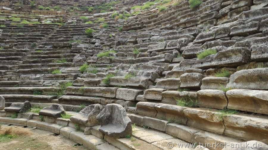 The cavea of the originally Greek theatre of Stratonikeia was built in the Kadıkulesi, a natural slope. In Roman times there were a lot of alterations and extensions. Under Augustus (Roman Emperor 31 BC - 14 AD), or immediately thereafter, the old stage house was replaced by a new three-storey building. |
