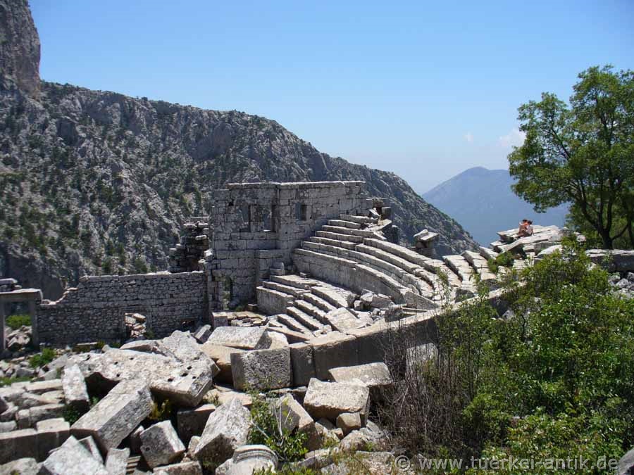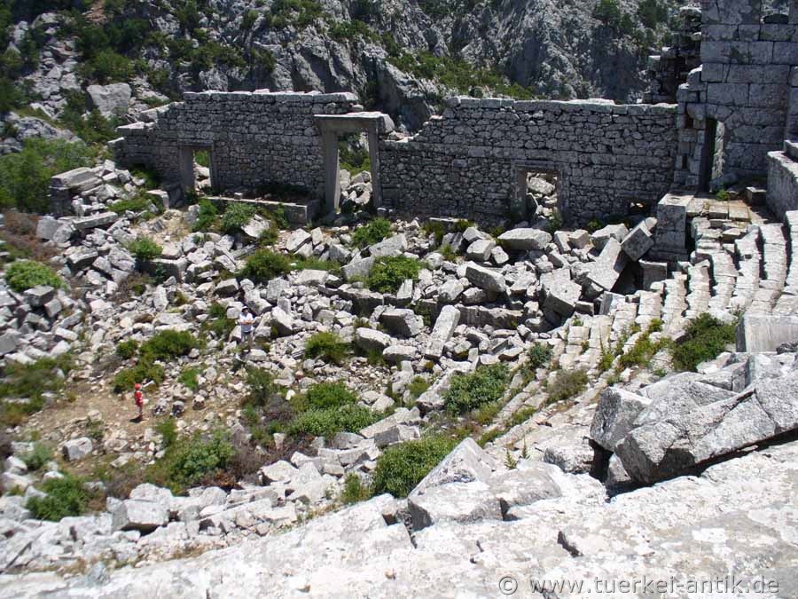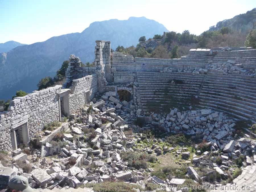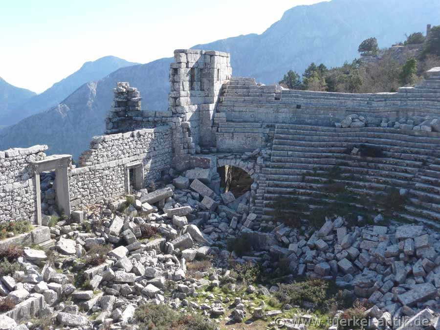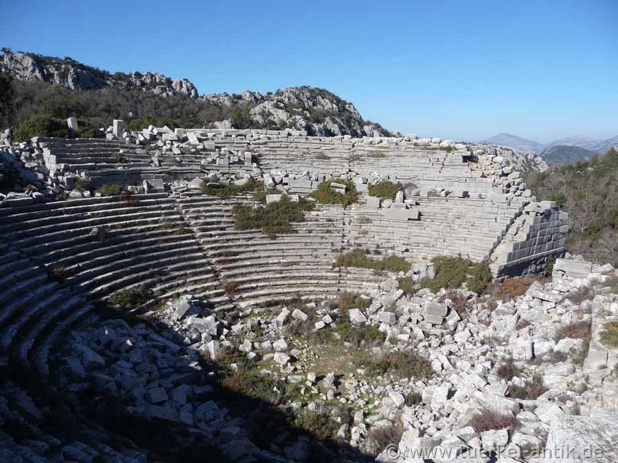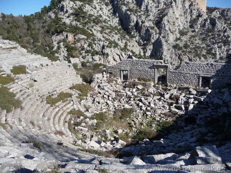 The originally Greek theatre of Termessos was built in the early 2nd century B.C. and rebuilt under Augustus (Roman emperor from 31 B.C. to 14 A.D.). It was only in the late 2nd century AD that the stage house was added, of which a large part of the stage front is still preserved today. At a later date, a portico was erected above the uppermost tiers, but it did not survive the subsequent earthquakes. |