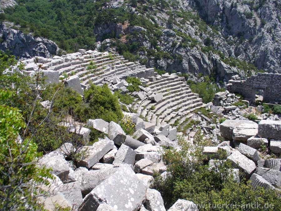 According to old traditions, the town of Termessos already existed in the 7th century BC. Termessos was first mentioned by Homer. The town made a name for itself by plundering pamphillic towns in the plain. Due to its protected location and the impregnable defences, the city was able to resist all attackers in the clouds. In 500 B.C., the Persian Empire had to grant autonomy to the city because of Termessos' defensiveness. Alexander the Great besieged Termessos in vain in 334/333 BC: "I will not let my army decimate before an eagle's nest". During the Diadochi Wars Alketas, brother of Perdikka, died there. In the time of Hellenism, the city belonged at times to the sphere of influence of the Ptolemies and the Attalids of Pergamon, but through the skilful combination of military strategy and diplomacy it was able to maintain its identity and freedom until Roman times. Termessos belonged to the province of Lycia et Pamphylia, and in late antiquity to the province of Pamphylia. |