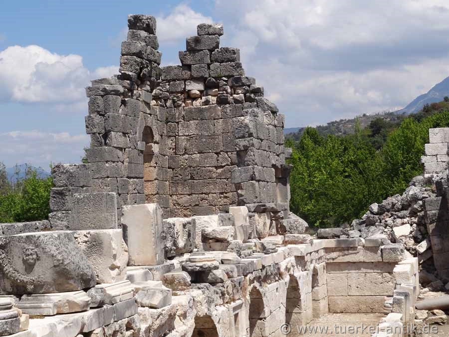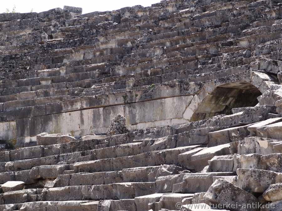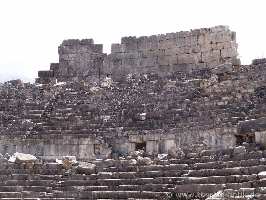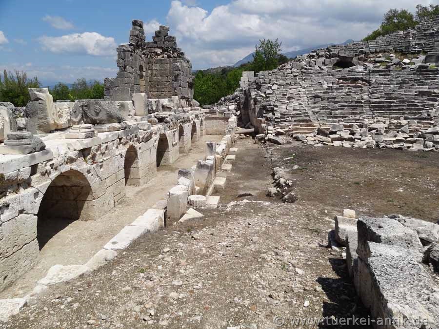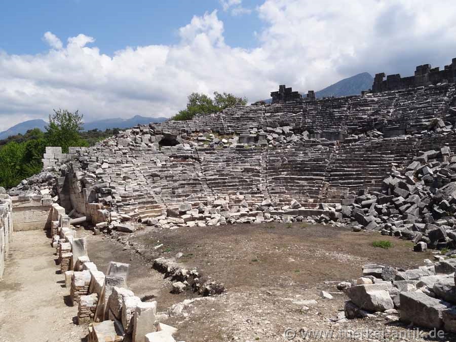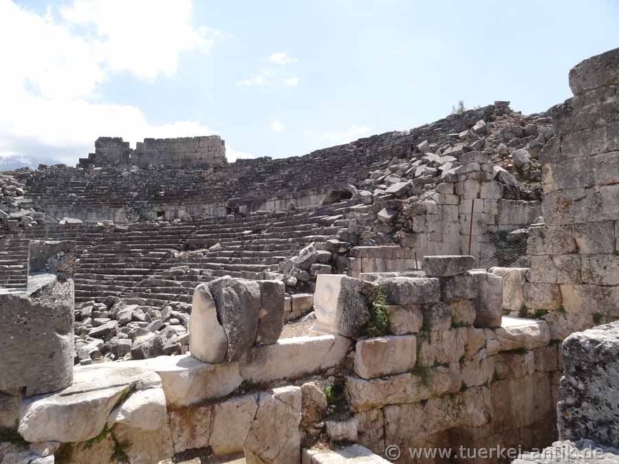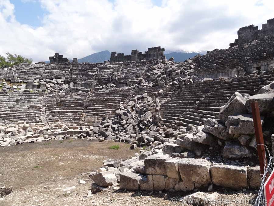 The Roman theatre of Tlos, which stands freely in a plain, was built around the turn of time according to an inscription found, presumably under the Roman emperor Augustus (31 BC - 14 AD). As recently discovered during the excavations of the Limyra Theatre, the cavea of the Tlos Theatre was erected on a vaulted structure with a circumferential vault, similar to that of the Side Theatre. The stage house has been completely destroyed. The theatre, like the entire city and several other cities of the Lycian League, was destroyed by a devastating earthquake in 141 AD. The Euerget Opramoas of Rhodiapolis also donated a considerable sum for the reconstruction of the theatre of Tlos. |