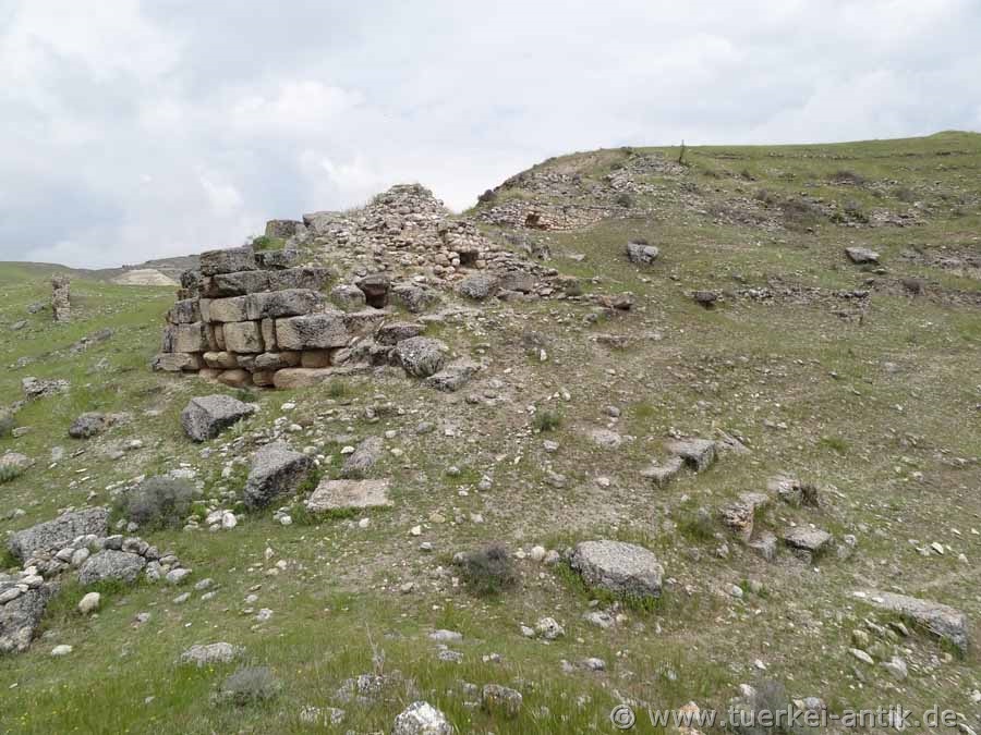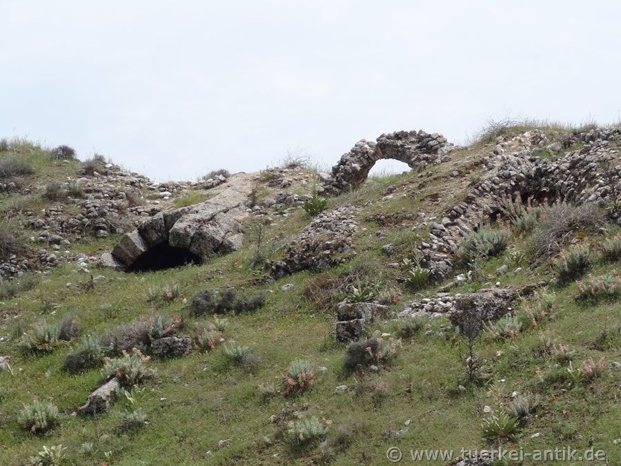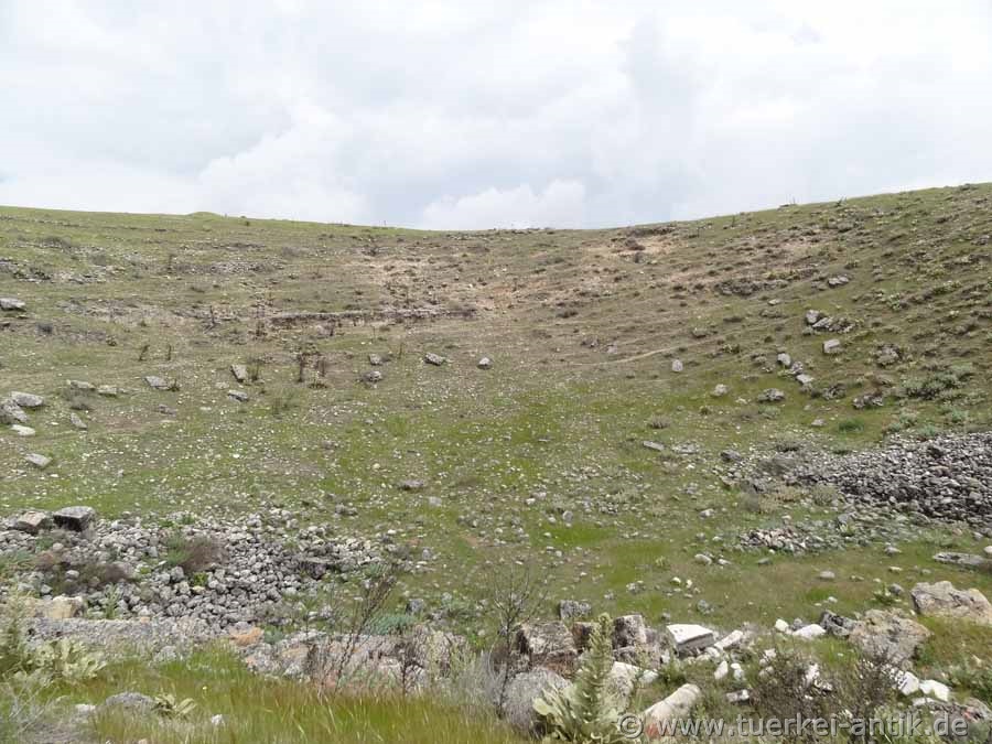 The Hellenistic-Roman theatre was built with an inclination of 50 degrees in a hollow on a natural slope and has not yet been excavated. Its origin dates back to the 2nd century AD. Parts of the rows of seats seem to have slipped into the orchestra. The diazoma could be reached from the outside through a vault. The parodoi were made of travertine stone, while marble blocks were used in the construction of the stage house. The original stage house measuring 7.3 x 40 m has been destroyed except for its foundations. |