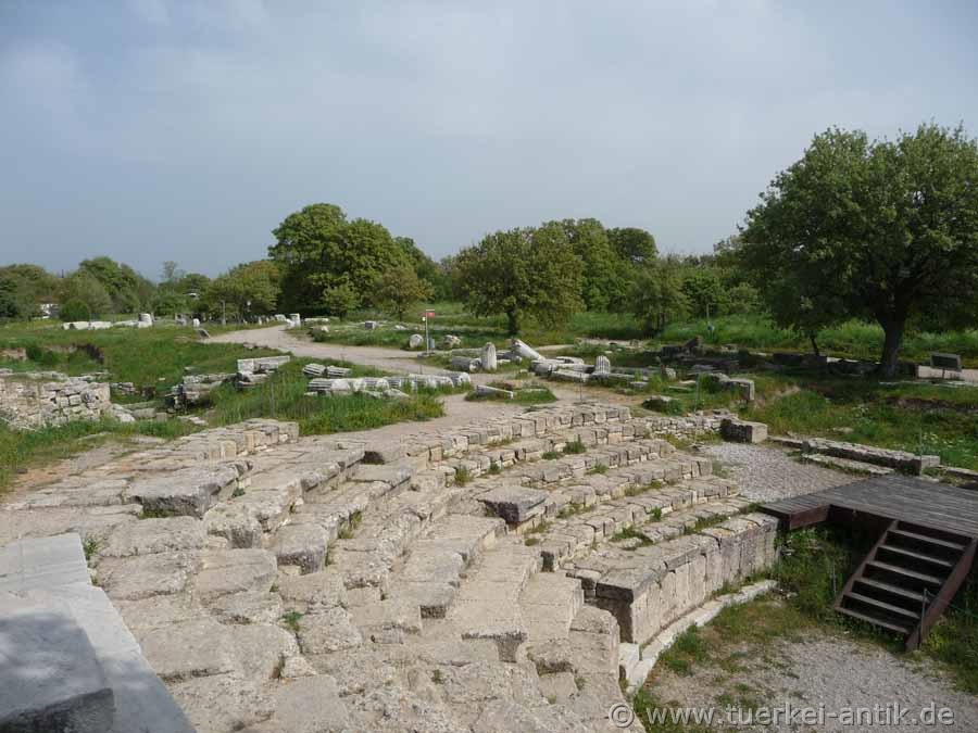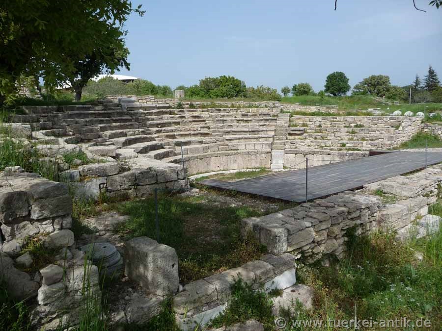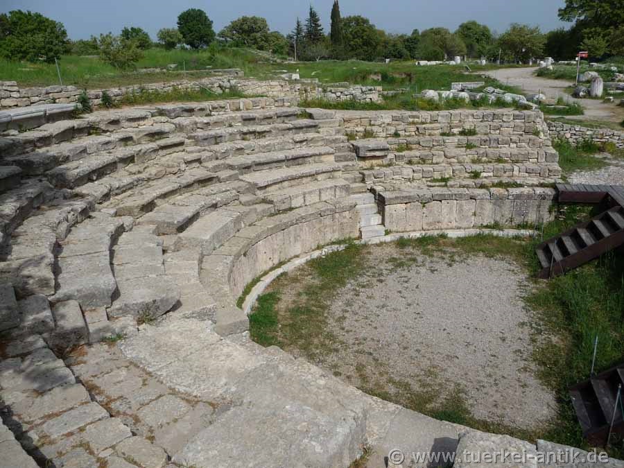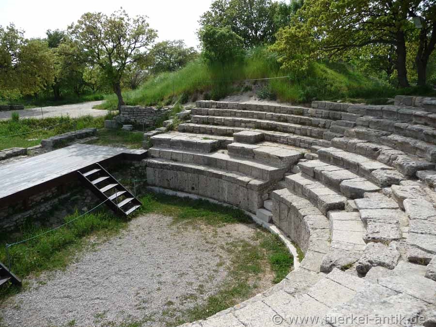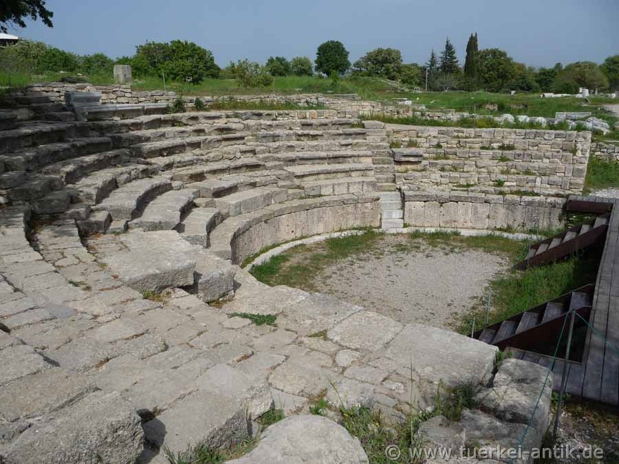 Considering the age and the total of 9 layers of Troy's settlement, the Roman epoch in which the theatre was built almost falls into insignificance. Archaeologists seem to disagree whether it is a small theatre or an Odeon, a mostly covered building used for performances and competitions in singing and instrumental music as well as recitation lectures and council meetings. The theatre (or odeon) was built at the beginning of the 2nd century AD. The architect deviated from the usual construction method. Emperor Hadrian visited the city in 124 AD and ordered considerable reconstruction and decoration work. One entered the Odeon through entrances left and right of the skené and entered after passing a small anteroom the auditorium. Translated with www.DeepL.com/Translator |