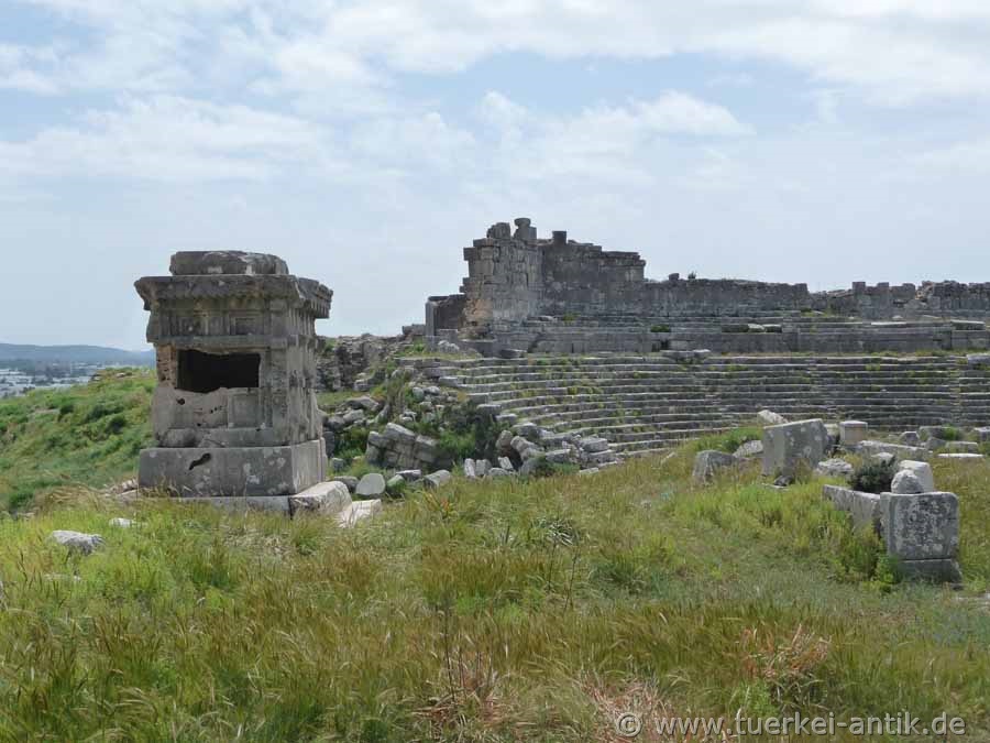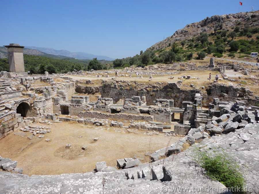 The ancient city of Xanthos and the associated temple district of Letoon, the capital and federal sanctuary of the Lycian League, are at the heart of Lycia's history. In addition to important remains of temples and urban buildings, Xanthos stands for a number of unique Lycian monuments whose tombs, pillar tombs and sarcophagi are richly decorated with reliefs and sculptures. Xanthos and Letoon lie about 65 km southeast of Fethiye and have been part of the UNESCO World Heritage since 1988. Although already inhabited since the 8th century, this city only enters history in Herodotus' account of the events of the year 545 BC. In a desperate defensive struggle against the troops of the Persian commander Harpagos, the Lycians retreated to the fortified city and fortified themselves. The men collected their wives, children, slaves and all possessions in the castle of the Acropolis and burned them down completely. They resolutely dared a failure, in which all were killed by the Persians. According to Herodotus, only 80 families survived because they were outside the city at the time of the Persian attack. Another major fire was the result of the Athenian conquest of Xanthos around 470 BC by the commander Kimon. The following dependence on Athens ended the Persian city prince Kherēi 429 B.C. with a victory over another fleet expedition of Athens, which was led by Melesandros and which fell in battle. This triumph is described by the inscription pillar of Xanthos. In the following 100 years under loose Persian sovereignty Xanthos blossomed - the city area was extended and the preserved splendid tombs and monuments were built. Conquered by Alexander the Great in 334/333 B.C., the city soon fell under the rapidly changing rule of the subsequent Diadochian empires. 188-168 B.C. the city was under the rule of Rhodes. From then on Xanthos stood at the head of the Lycian League and cultivated friendly contacts with Rome. The next catastrophe, which was regarded by contemporaries as a repetition of the tragedy of 545 B.C., occurred in 42 B.C. In the turmoil of the Roman civil war Brutus sought to raise troops and collect money. The Lycian troops were defeated, the city besieged and again the Xanthians burned down all buildings with women and children and killed each other. This was also recorded in Rome with shock. First under Marcus Antonius, later under Vespasian, the city was rebuilt, equipped with theatre and Agora (market place) and enjoyed permanent imperial protection and promotion. These buildings were neglected in Byzantine times, when the population - as everywhere in Asia Minor - had to retreat to the Stadtberg and expanded it with the antique components to a fortress. Since the Arab incursions from the 7th century onwards, Xanthos was largely abandoned and sank to an insignificant village. |