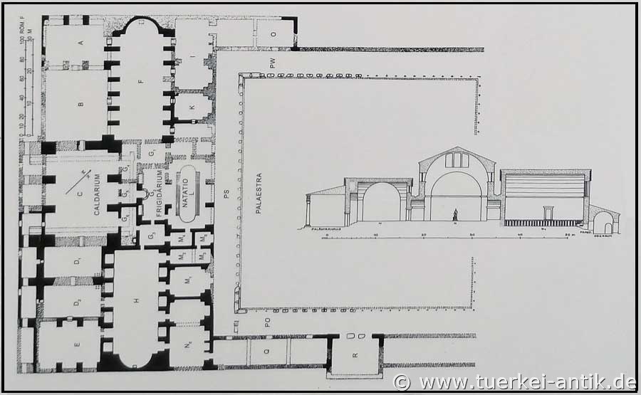 Der Bäderkomplex mit angrenzender Palästra befindet sich im Westen der Stadt auf dem Weg vom Zeustempel zum Stadion-Theater-Komplex. Erbaut wurde er in der zweiten Hälfte des 2. Jh. n. Chr.