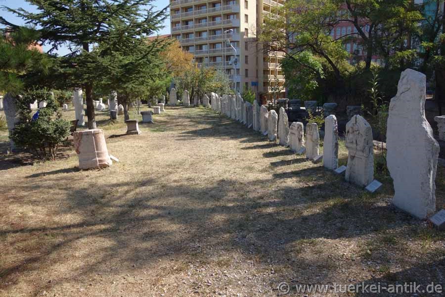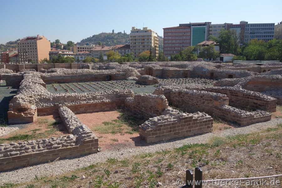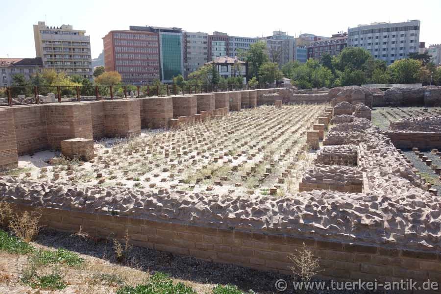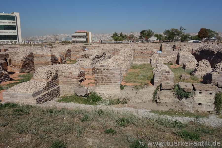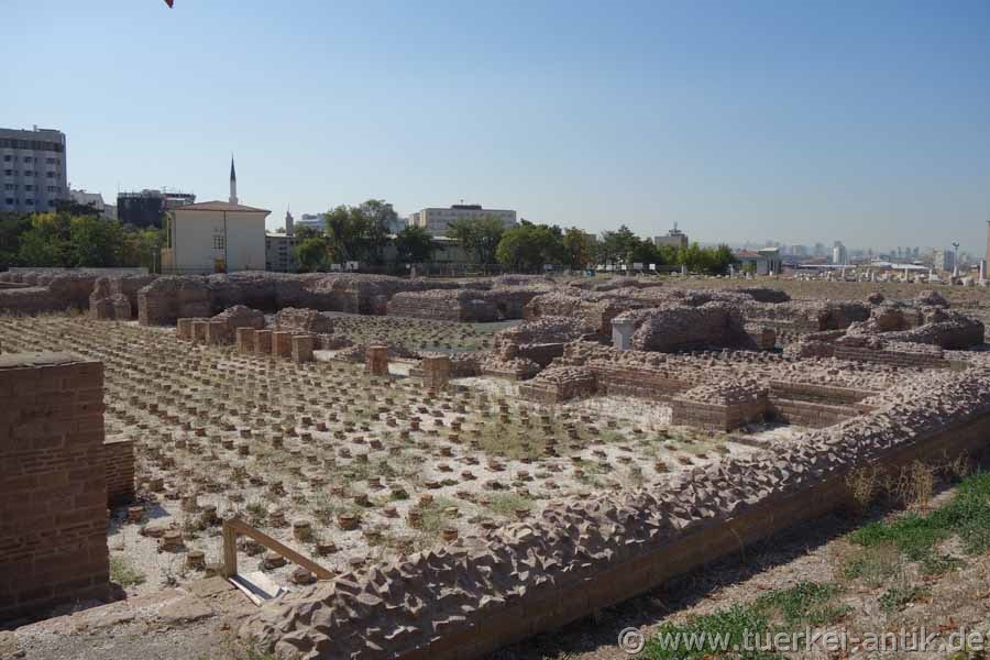 Das römische Bad aus der Zeit des Kaisers Caracalla (211-217), liegt im historischen Zentrum von Ankara. Es wurden dort auf einem flachen Siedlungshügel errichtet, der sich heute etwa 2,5 Meter über die Straße erhebt. Der heutige Eingang zum Gelände liegt im Osten. Von dort betritt man zunächst den Platz der Palaestra, die etwa 80 × 80 Meter einnahm. Der Übungsplatz war an allen vier Seiten von Portiken mit jeweils 32 Säulen umgeben. Diese waren sechs Meter hoch, hatten korinthische Kapitelle und trugen einen Architrav mit Inschriften. Im östlichen Eingangsbereich waren vermutlich Statuen aufgestellt, je zwei Räume im Norden und Süden können Bibliotheken oder Leseräume gewesen sein. Im Norden der Palaestra wurden 17 Meter der Säulenstraße mit danebenliegenden Ladenräumen ausgegraben, die wahrscheinlich zum Augustustempel führte. Östlich der Palaestra, nahe dem Eingang, ist ein byzantinisches Grab aufgebaut. Der unterirdische Grabbau wurde 1930 nahe dem Hauptbahnhof von Ankara bei Bauarbeiten für ein Verwaltungsgebäude gefunden und hierher versetzt. Das Grab hat zwei sich kreuzende Tonnengewölbe und wird ins 3./4. Jahrhundert datiert, es wurde vom Museum von Ankara restauriert. |