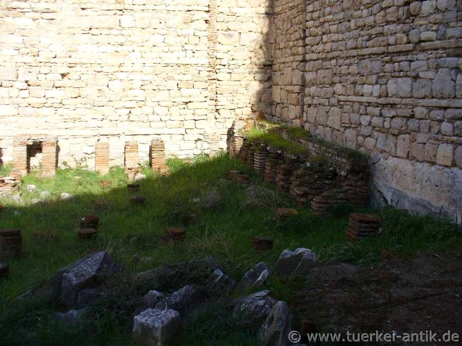 Beide Wege führten ins Apodyterium, einen L-förmigen Saal mit zehn Nischen und einer Apsis, von dem aus man vermutlich auf die Kuretenstraße blicken konnte. In einer Ecke des Raumes hat sich ein kleiner Rest des ursprünglichen Bodenbelages aus farbigem Marmor erhalten, der restliche Fußboden stammt aus der Zeit um 400. Eine schmale Tür führt vom Tepidarium ins Caldarium. Hier sind die Mauern noch in ihrer originalen Höhe erhalten, die Wandverkleidungen stammen jedoch aus unterschiedlichen Epochen. Unter dem Boden dieses Raumes befand sich der Heizraum, der die ganze Anlage mit warmem Wasser und heißer Luft versorgte. Das zugehörige Hypokaustum ist gut erhalten. |