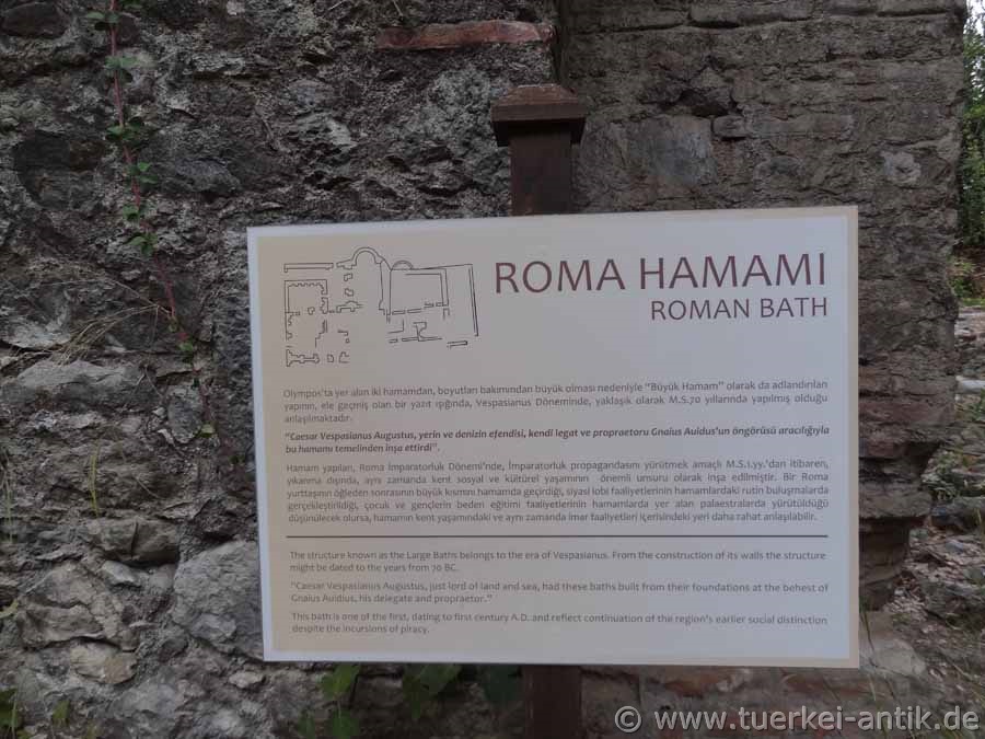 Das Vespasianus-Bad "Cäsar Vespasianus Augustus, gerechter Herr über Land und Meer, ließ diese Bäder errichten. Gründung auf Geheiß von Gnaius Auidius, sein Delegierter und Propraetor (Prokonsul)". Leider verdeckt die
